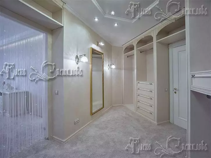 Гардеробная, по желанию хозяйки, просторная уютная комната с шикарной отделкой и мебелью из классической коллекции Mr.Doors в декоре «Декапе жемчуг».