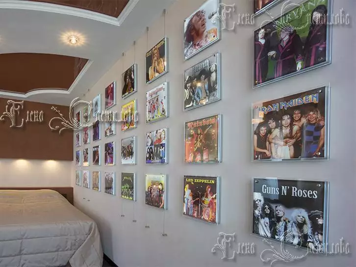 Заказчик настаивал, чтобы рамка отсутствовала. Специально для него разработали конструкцию. Стекло с полноцветной печатью крепится к стене, с помощью дистанционных держателей. Чтобы композиция не смотрелась слишком однообразно, композицию дополнили алюминиевые тросы-струны, проходящие через несколько рядов. На каждый диск предлагалось несколько вариантов дизайна. В итоге выбиралось окончательное изображение музыканта или группы. Шрифты с названиями писались вручную. Продумывалось так же расположение дисков по значимости исполнителя.