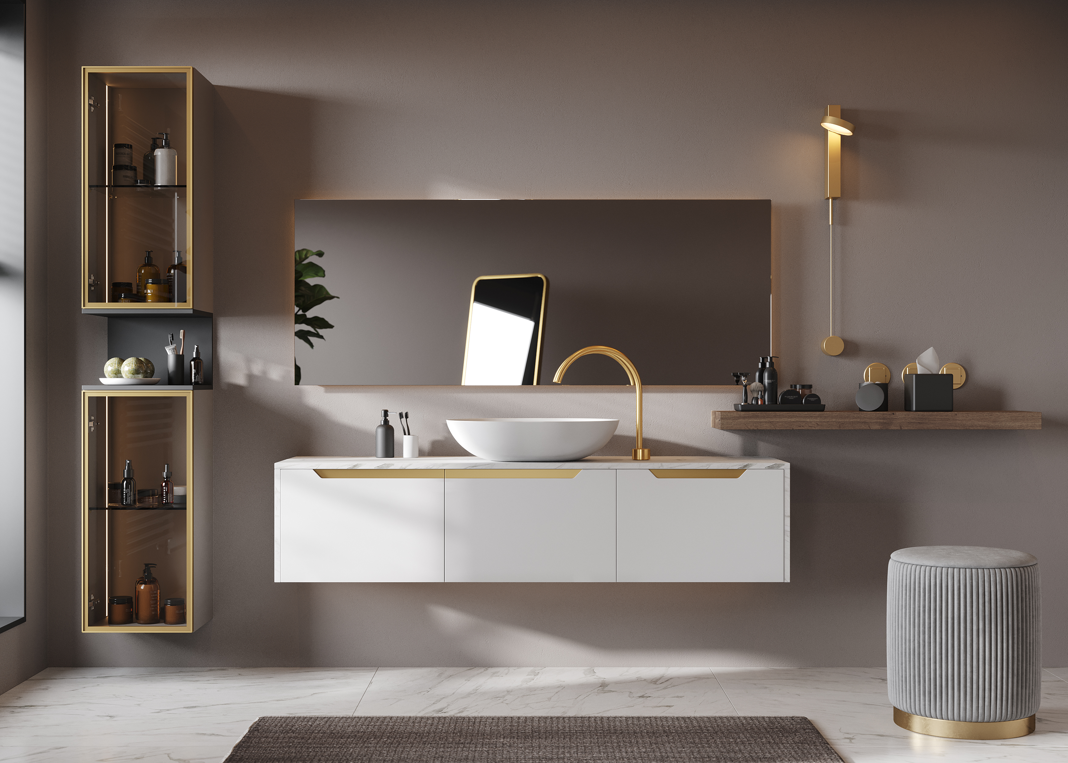 Меблировка санузлов и постирочных по индивидуальному проекту, разнообразные конфигурации тумб под раковину и столешниц (от влагостойкого ЛДСП и композитных плит до керамогранита), использование влагостойких материалов.