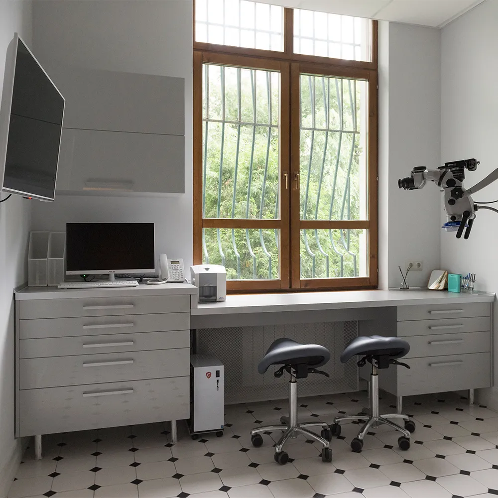 Современная мебель и фурнитура от австрийской компании Blum позволила обыграть каждый сантиметр стоматологического кабинета.