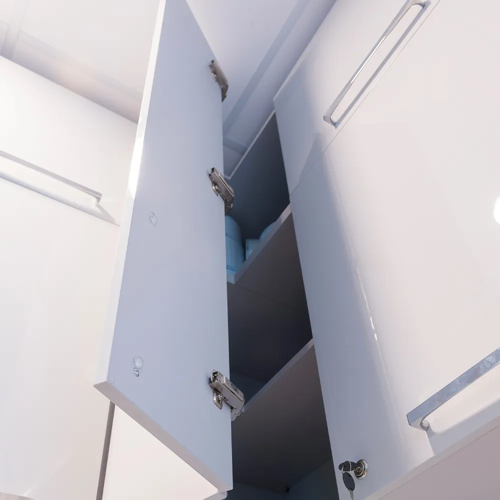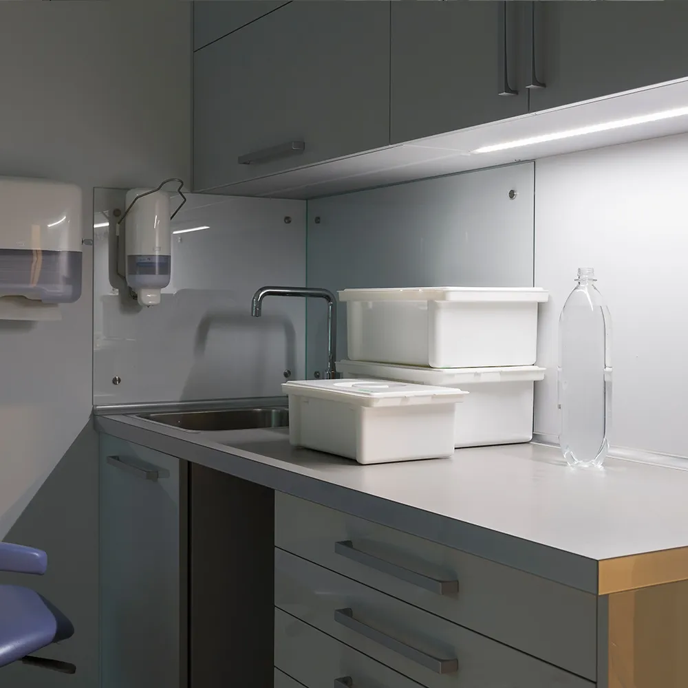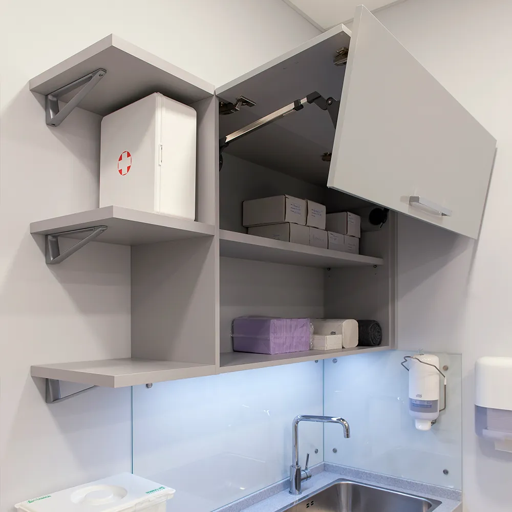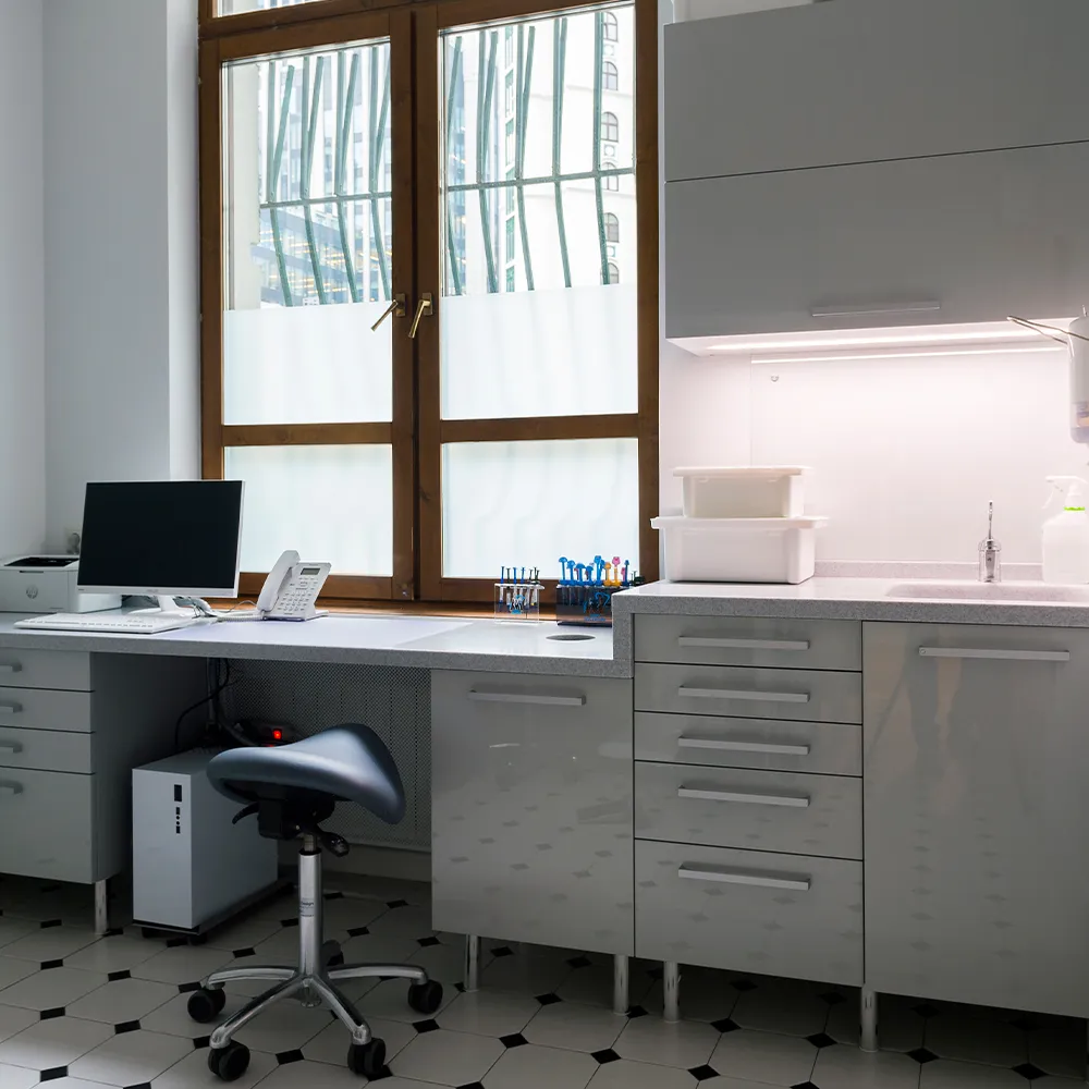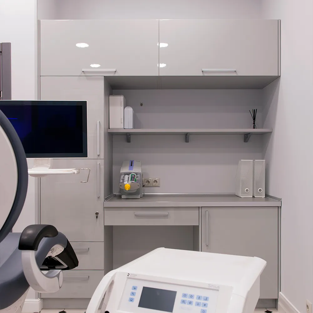 Ключевая особенность этого проекта — отверстия для вентиляции в столешнице, которые были сделаны на производстве. Они позволили нам не использовать дополнительный декор для вентиляции. Тумбы в рабочей зоне врача выполнены на высоких ножках, что особенно удобно при уборке и стерилизации помещения.