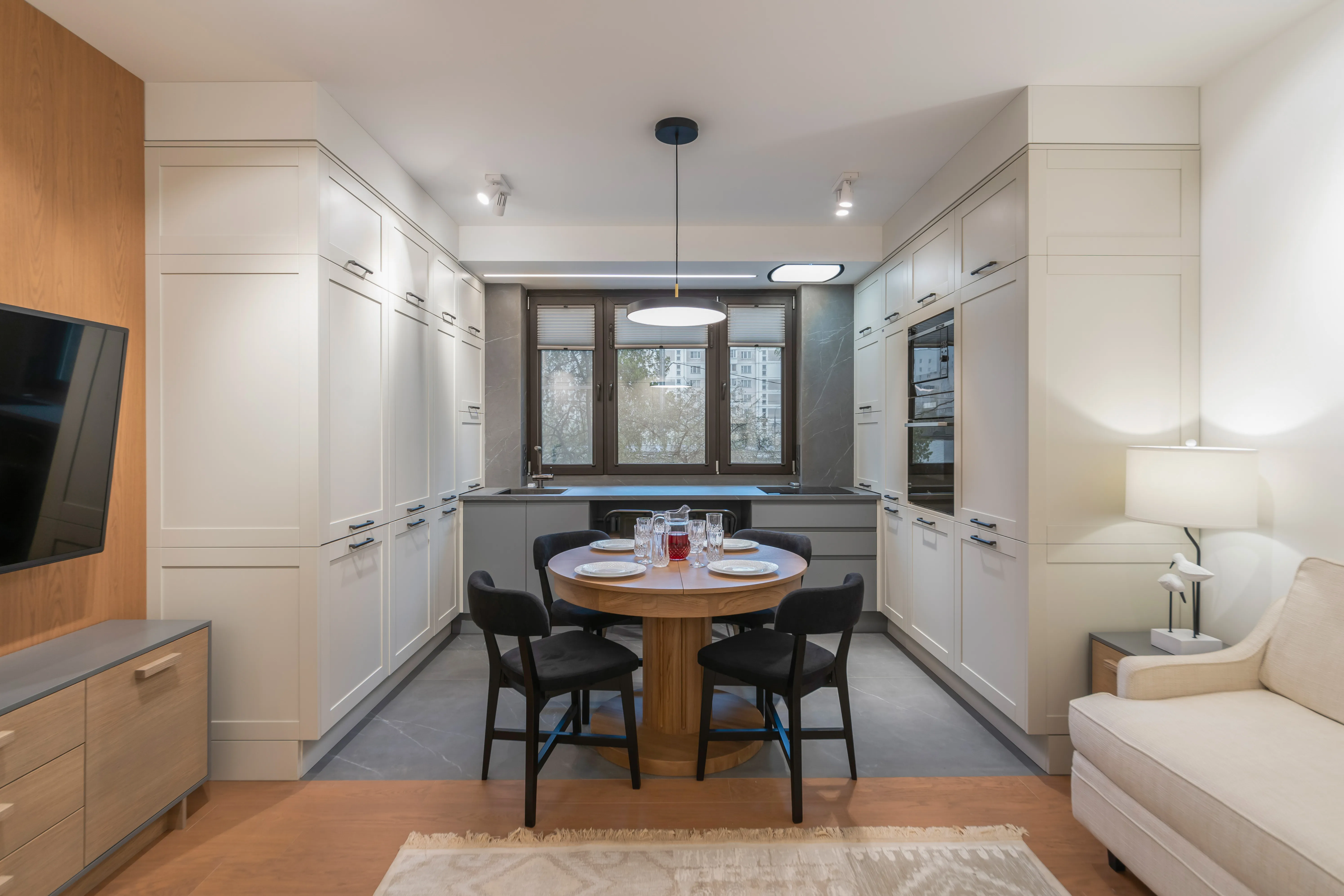 Кухня-столовая в доме героев занимает почти половину квартиры. Но и в ней мужская половина семьи тщетно пытается отвоевать место для дивана. Учтем интересы всех, а сгладит конфликт стол в виде большой деревянной катушки, которая в конечном итоге дала название всему проекту.