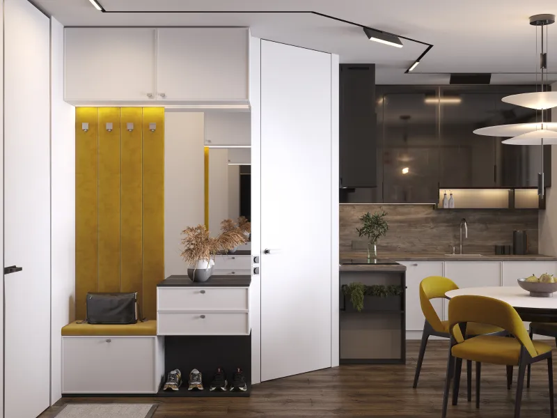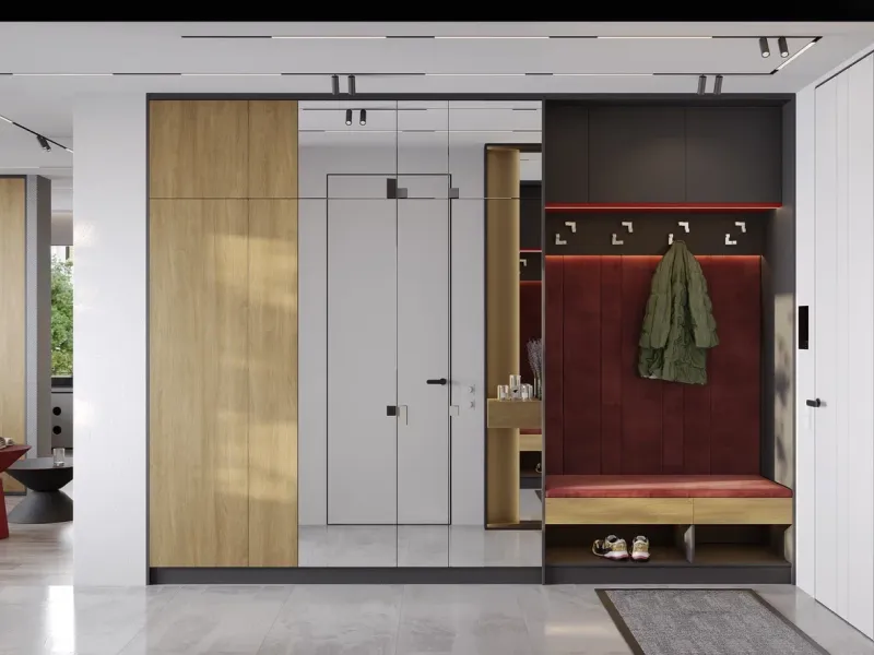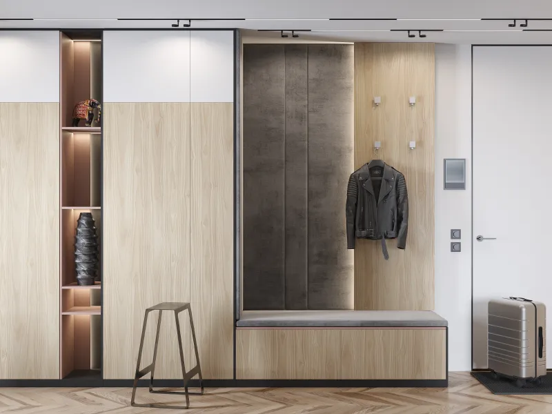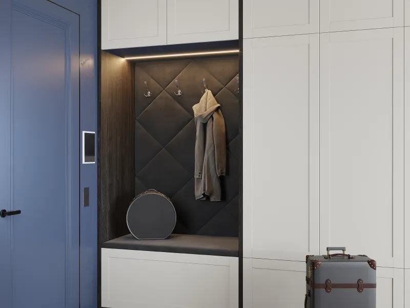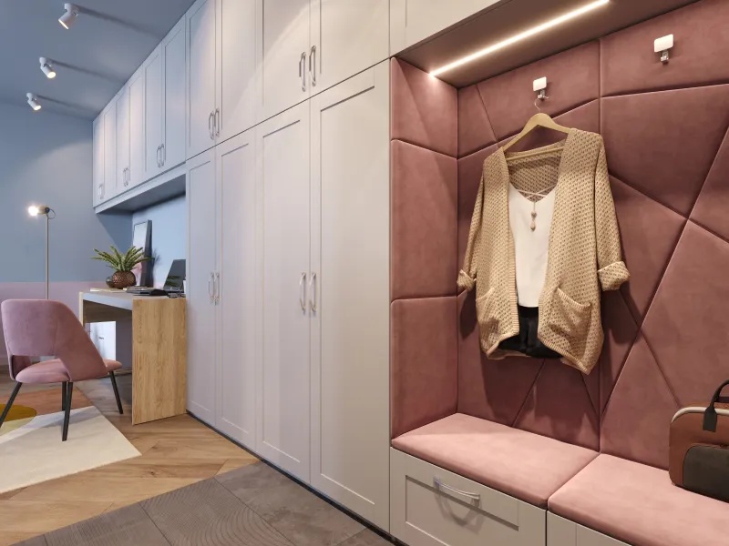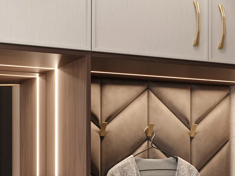 В прихожей мягкие панели могут быть использованы как в составе гарнитура, так и самостоятельно. Они будут прекрасно смотреться в качестве акцентной задней стенки, встроенной в общую композицию шкафов и стеллажей для прихожей. Можно оформить таким образом и обычную стену прихожей.
