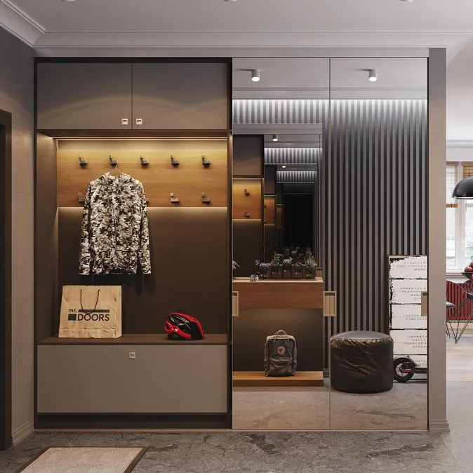 - Ну а для оформления широкой или просто большой прихожей лучше выбрать темные оттенки. Подойдут насыщенный коричневый, синий или зеленый цвета. Также можно использовать глубокие оранжевые или красные тона. Темные цвета характеры для классических интерьеров. Их правильный подбор способен наделить помещение благородством и элегантностью.