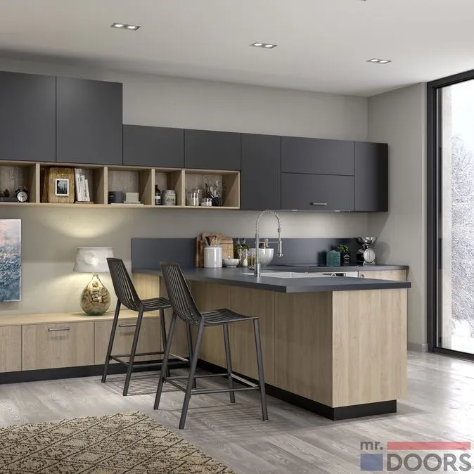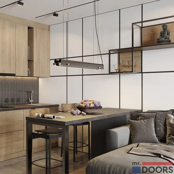 В качестве углового элемента к традиционной кухне, удлиняя рабочую поверхность. В этом варианте барная стойка имеет стандартную высоту, совпадающее с уровнем столешницы.