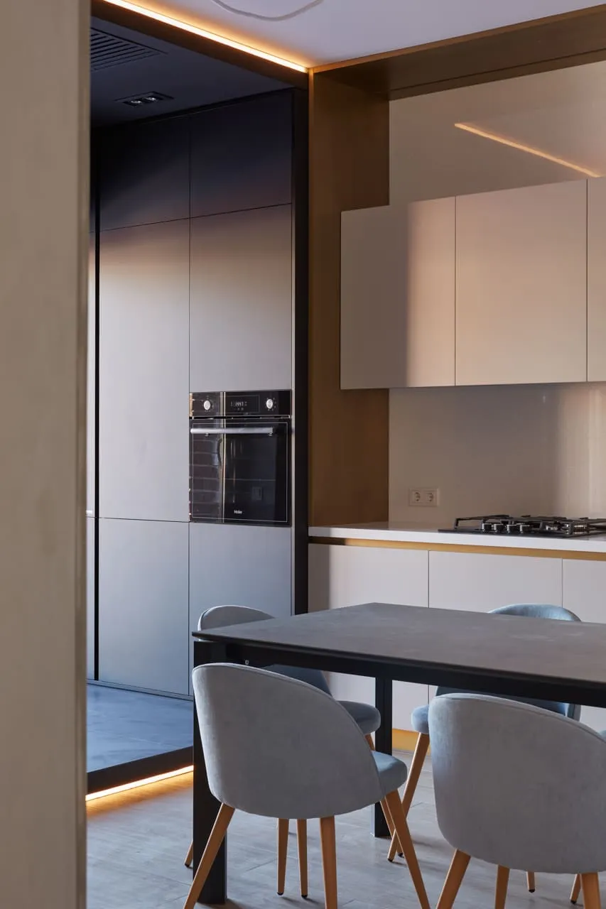 Поскольку хозяйка большую часть времени взаимодействует со светлой частью кухни, здесь разместили основной конструктив рабочей зоны. При этом получилась легкая, не перегруженная композиция с внушительной столешницей, системами хранения и декоративной нишей-витриной с задними стенками из зеркала и открытыми полками.