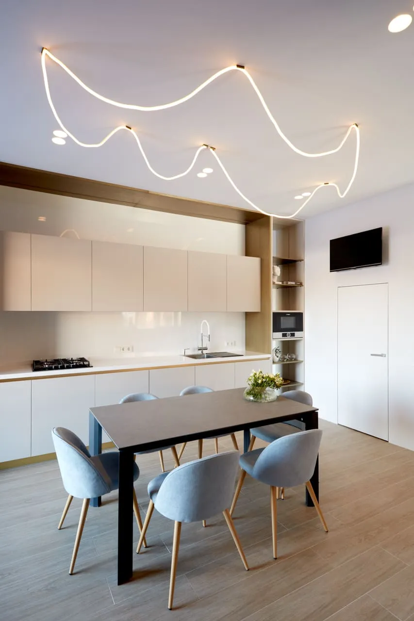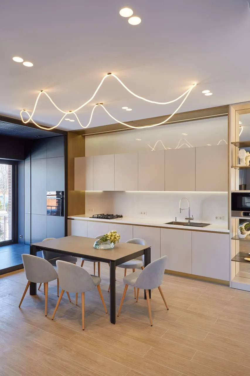 В семье наших героев четверо детей, поэтому размеры и удобство кухни крайне важны. При этом у супругов были диаметрально противоположные взгляды на стилистику гарнитура: глава семьи тяготеет к более брутальной чёрно-белой отделке, тогда как его супруге ближе мягкие светлые оттенки. Именно поэтому авторы проекта разделили кухню на две зоны: светлое рабочее пространство и вспомогательную тёмную часть на подиуме.