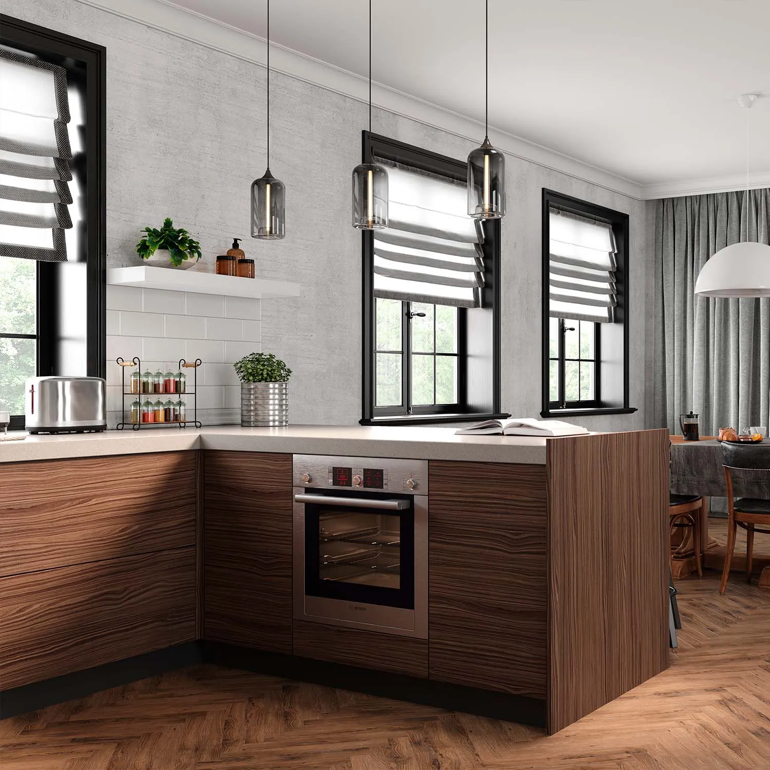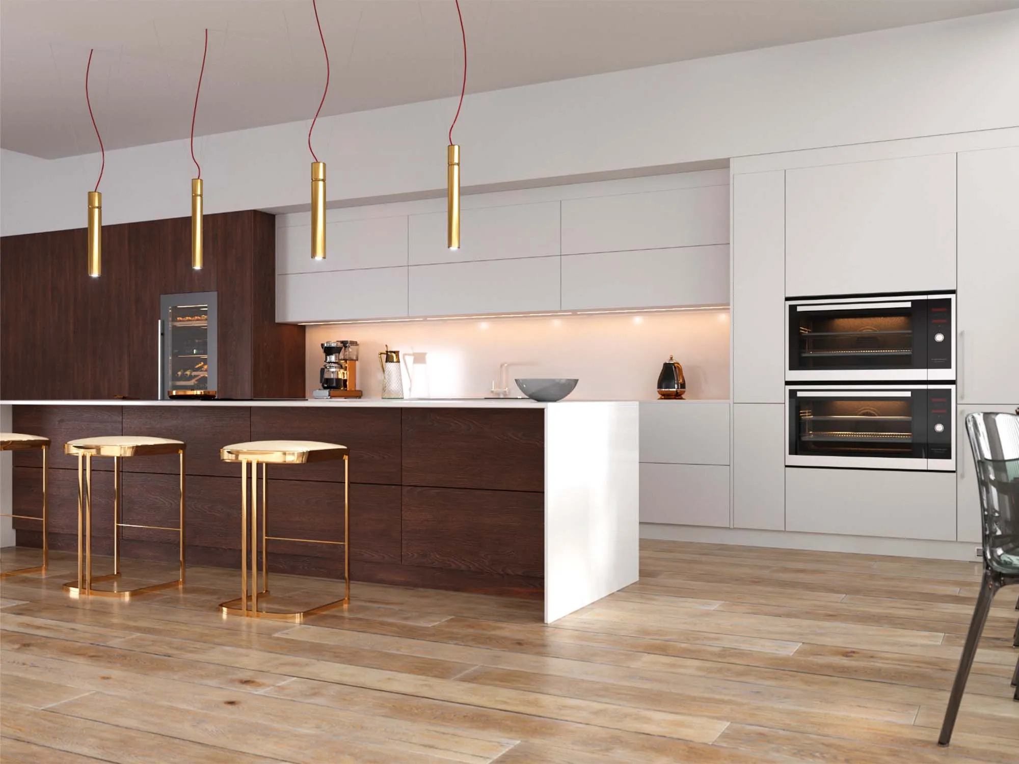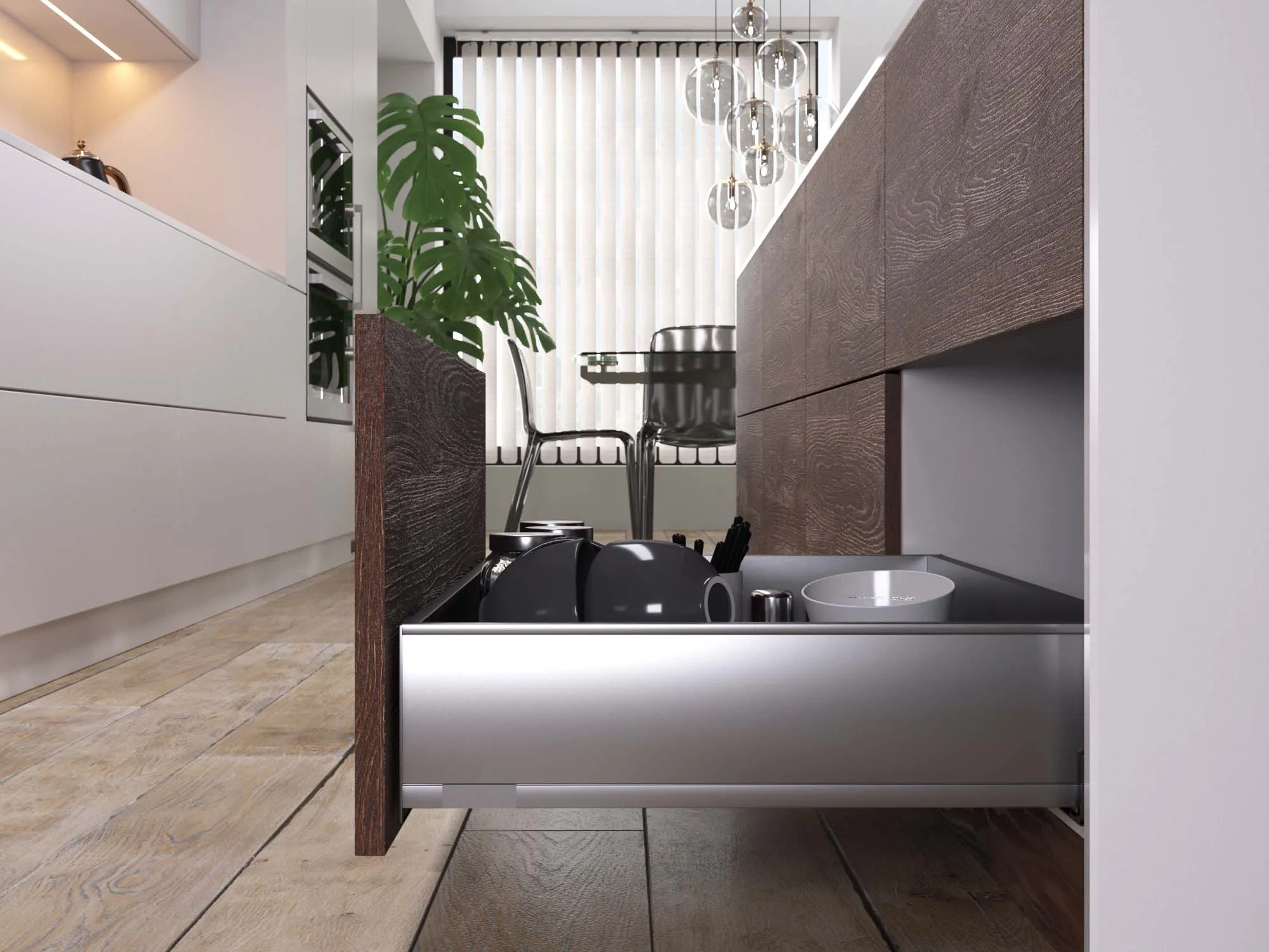 Дети любопытны. Но это не всегда хорошо. Особенно, на кухне, где в одном ящике лежат ножи, в другом множество приправ, которые так и хочется попробовать на зуб, за дверцами третьего прячется мусорное ведро. У ребёнка не должно быть свободного доступа ко всем этим сокровищам. Лучше выбирать фасады без ручек, которые ребёнку будет сложнее открыть. Например, с системой P2O (нажал/открыл).