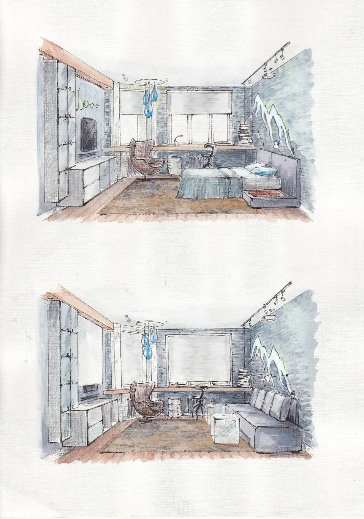 В основу переделки холла, гардеробной и гостиной, которую совместили со спальней легла страсть героев к снежным склонам и любовь к сноуборду.