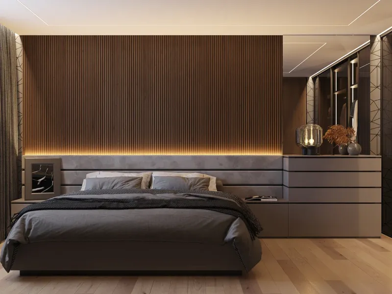 7. Если хочется добавить теплоты, можно заменить светлый базовый цвет на фактуру натуральных материалов. Например, использовать деревянные стеновые панели. Также смягчить интерьер помогут текстурные ткани в обивке мебели: велюр, букле, флок.