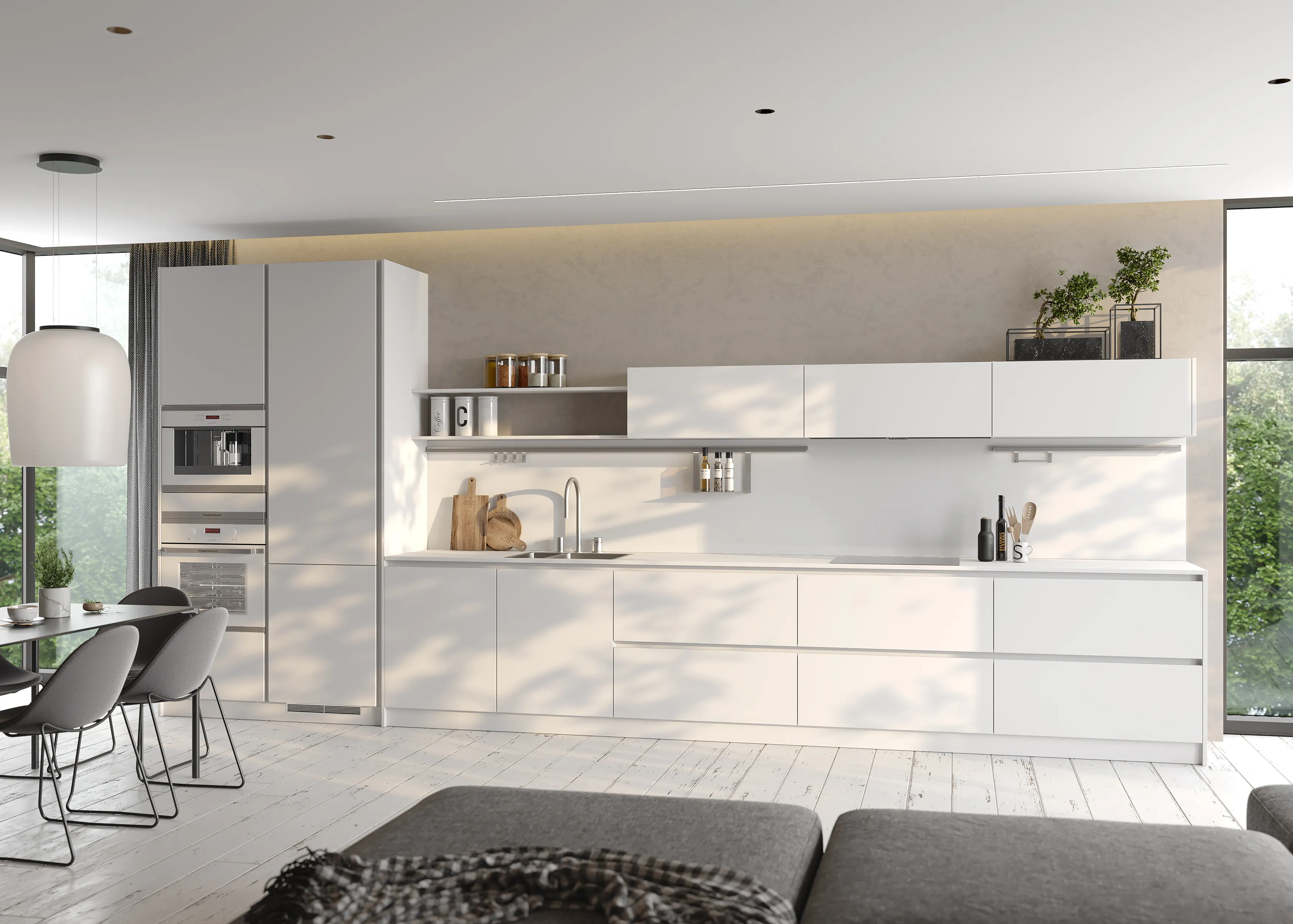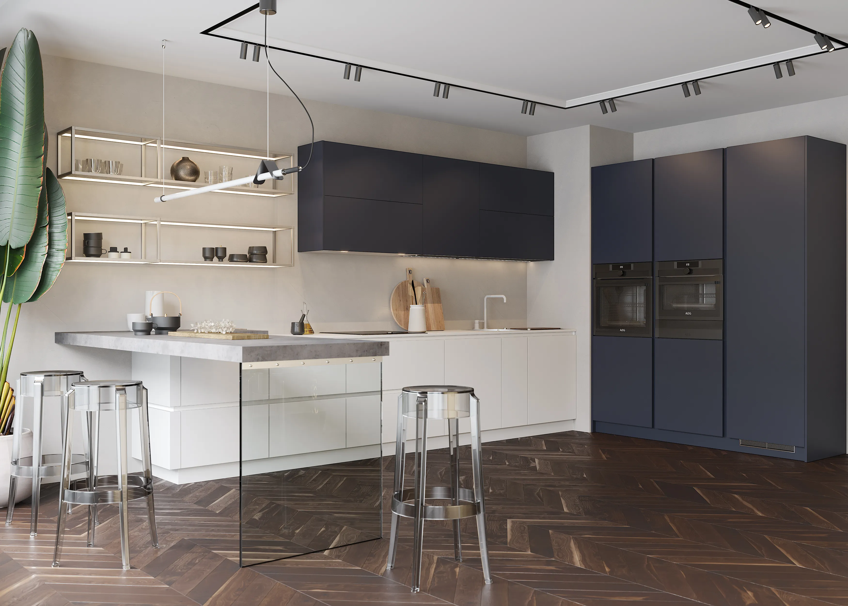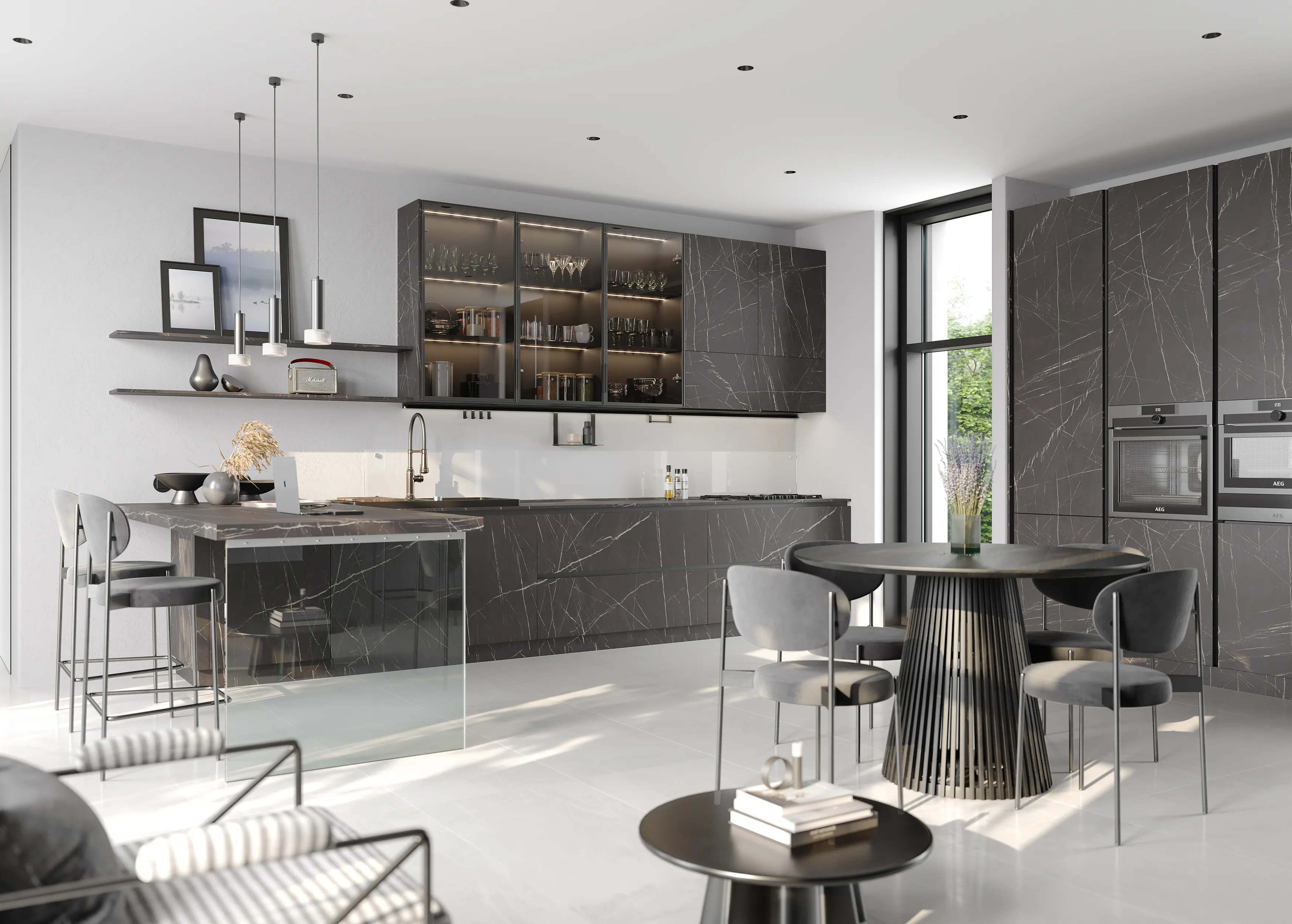 В кухне MAS похожий эффект достигается за счет комбинирования монолитных корпусов с фасадами FUTUR SX из стёкол в тонкой алюминиевой рамке и с профилями Gola.