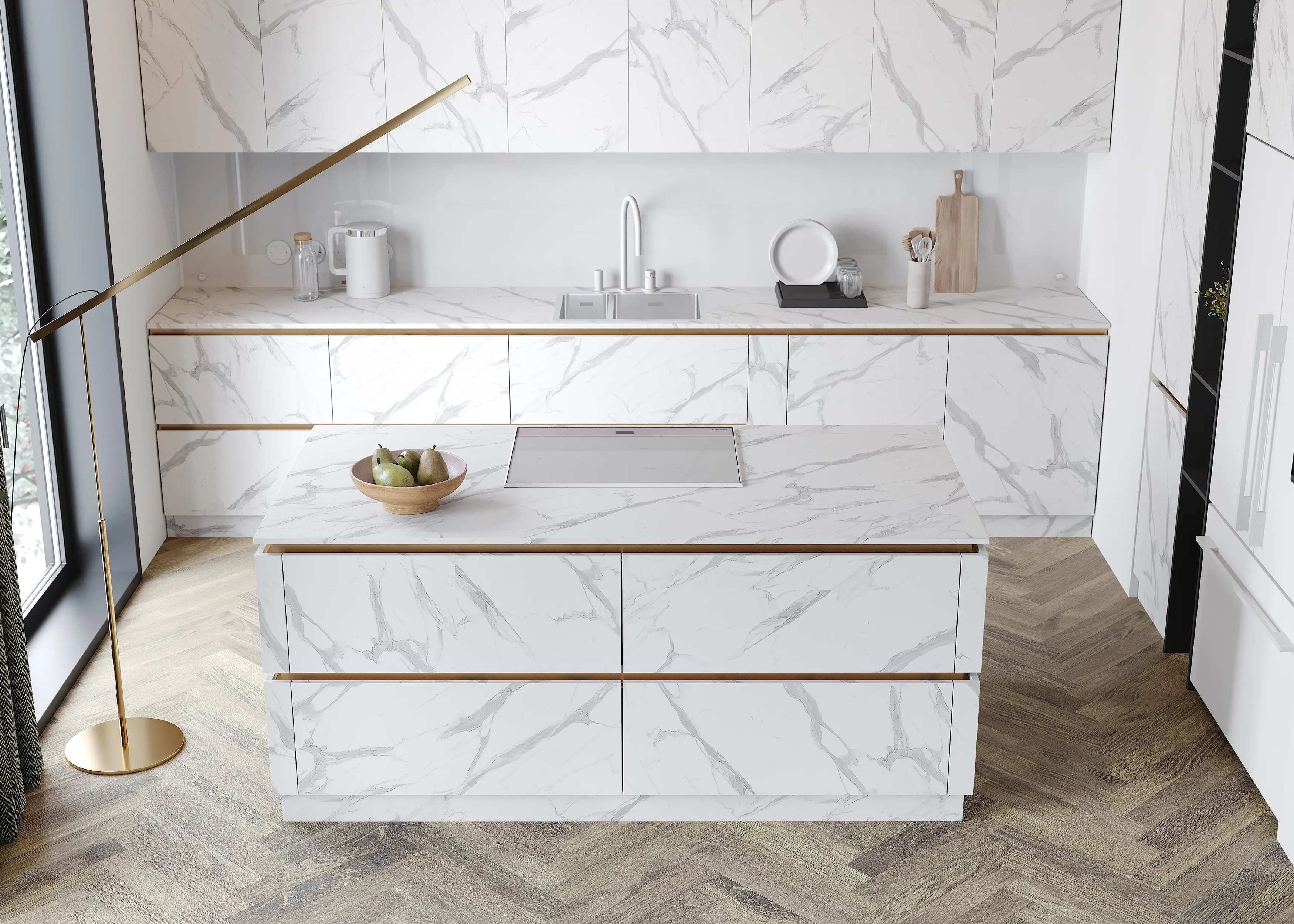Монолитом обычно называют каменную глыбу, появившуюся в природных условиях или обработанную. Имитация камня придаёт кухне поистине премиальный внешний вид, который подчеркнут чистотой и лаконичностью форм. Эффект достигается посредством исполнения всех фасадов, сайдов, столешниц, фартука и пристеночных бортиков в едином декоре. Это и создаёт впечатление монолитного, цельного образа. Монолитные кухни идеально впишутся в интерьеры в стиле Минимализм, и будут выглядеть органично в индустриальной среде или интерьерах скандинавского модерна.