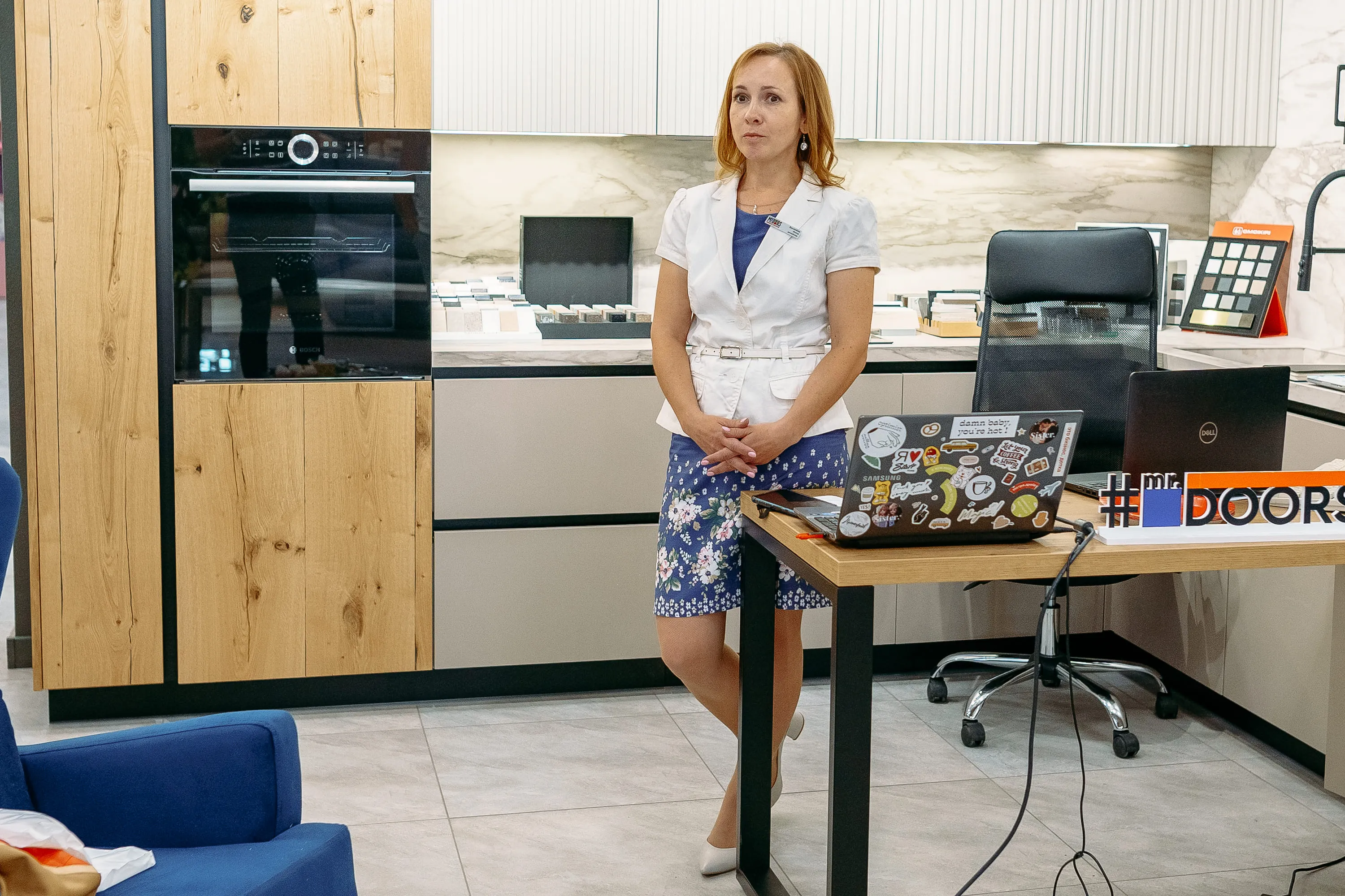 Одним из спикеров вечера была Вероника Антелава – архитектор, дизайнер мебели, руководитель отдела по работе с дизайнерами интерьера, архитекторами и декораторами компании Mr.DOORS.