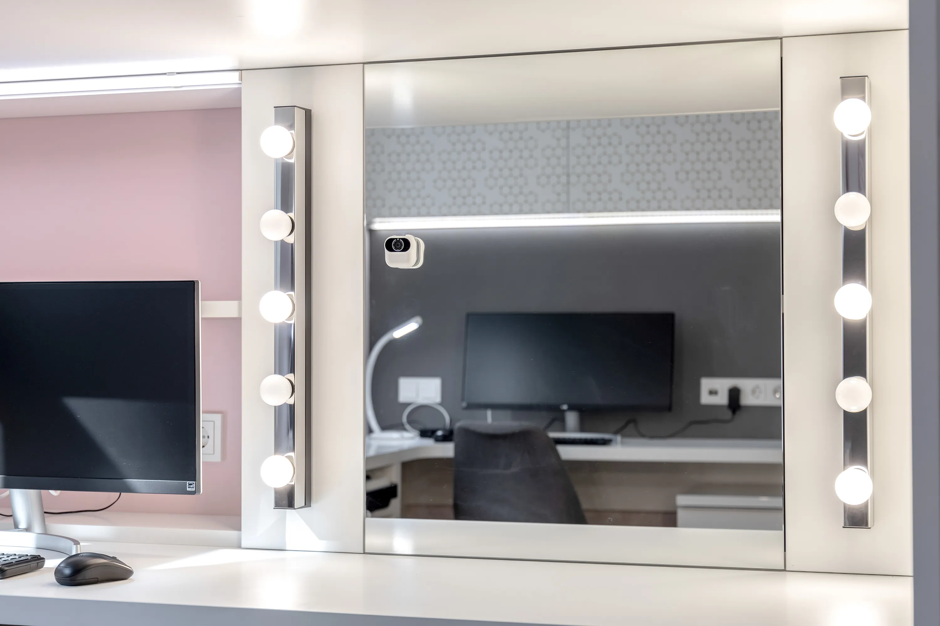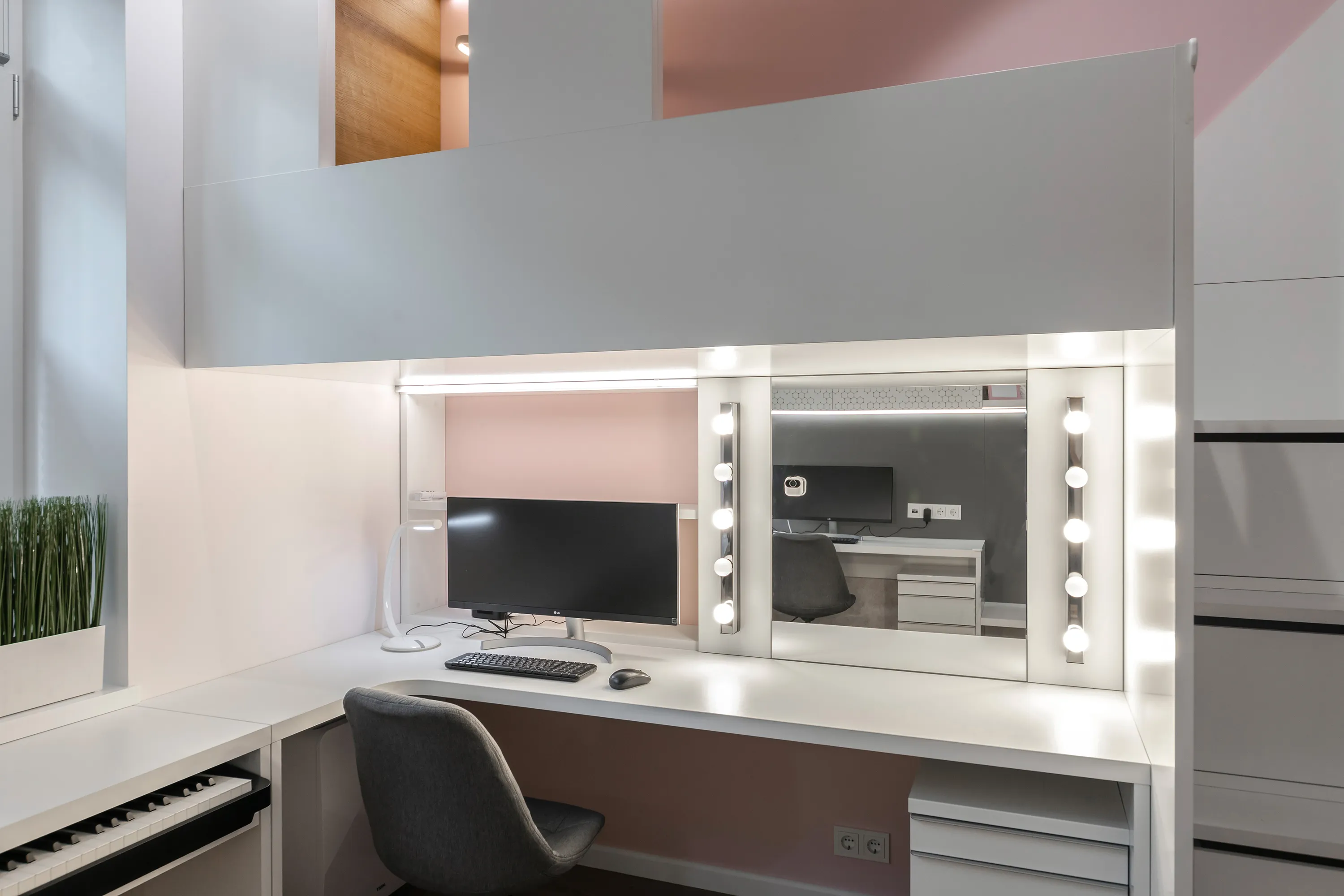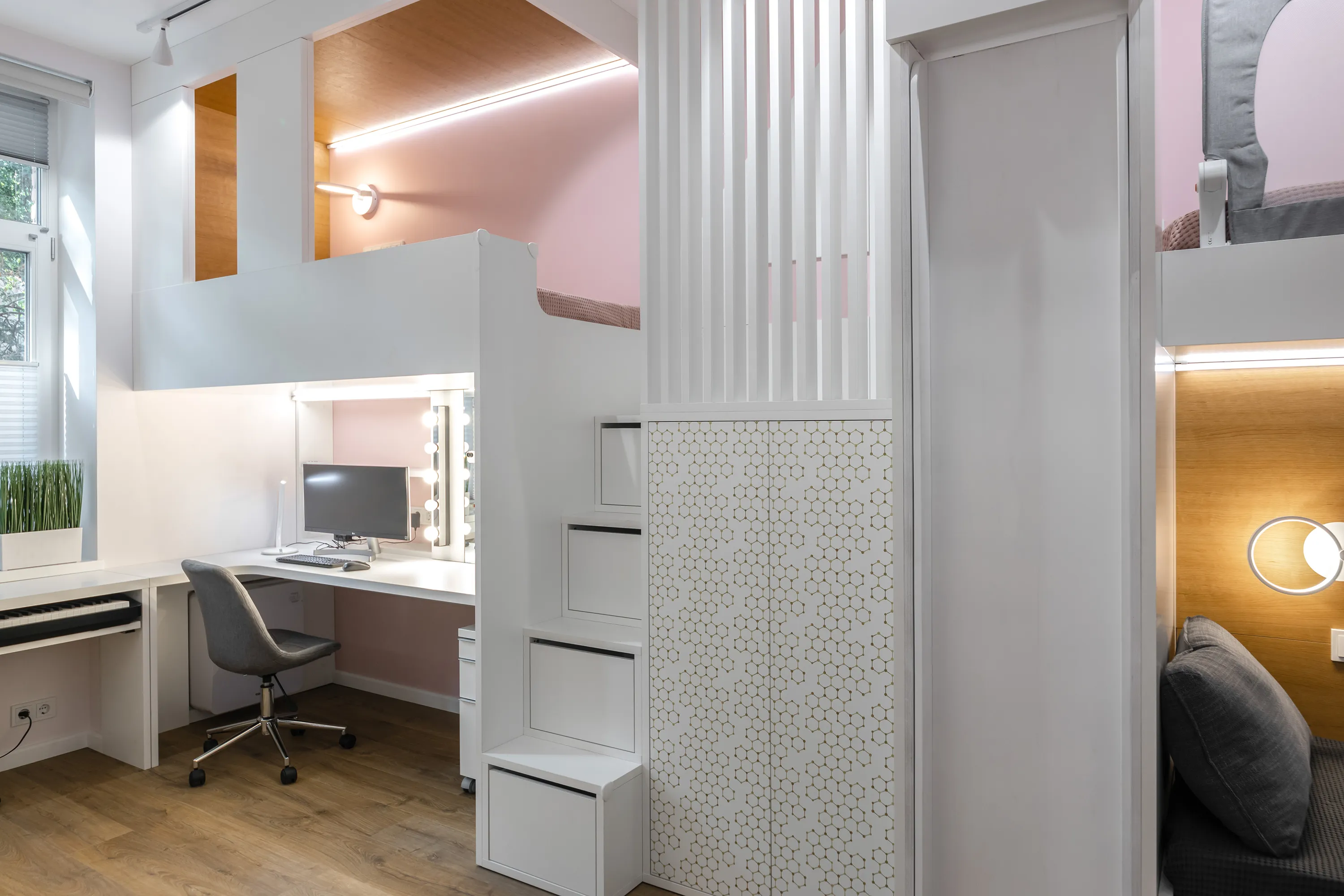 Под кроватью возле окна организовано рабочее место, совмещенное с импровизированным туалетным столиком (за зеркальным фасадом Skin спрятаны полочки для различных девчачьих мелочей).