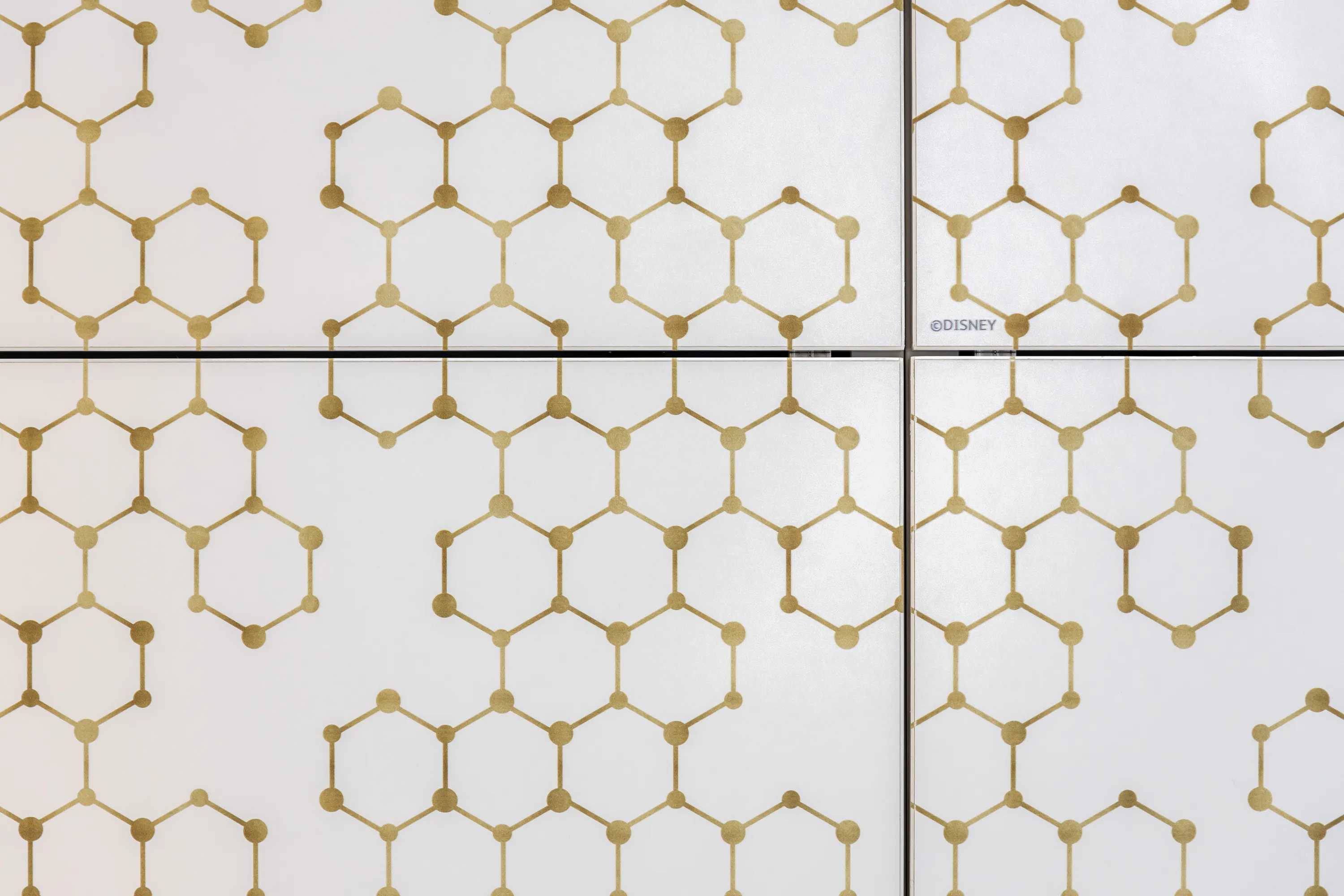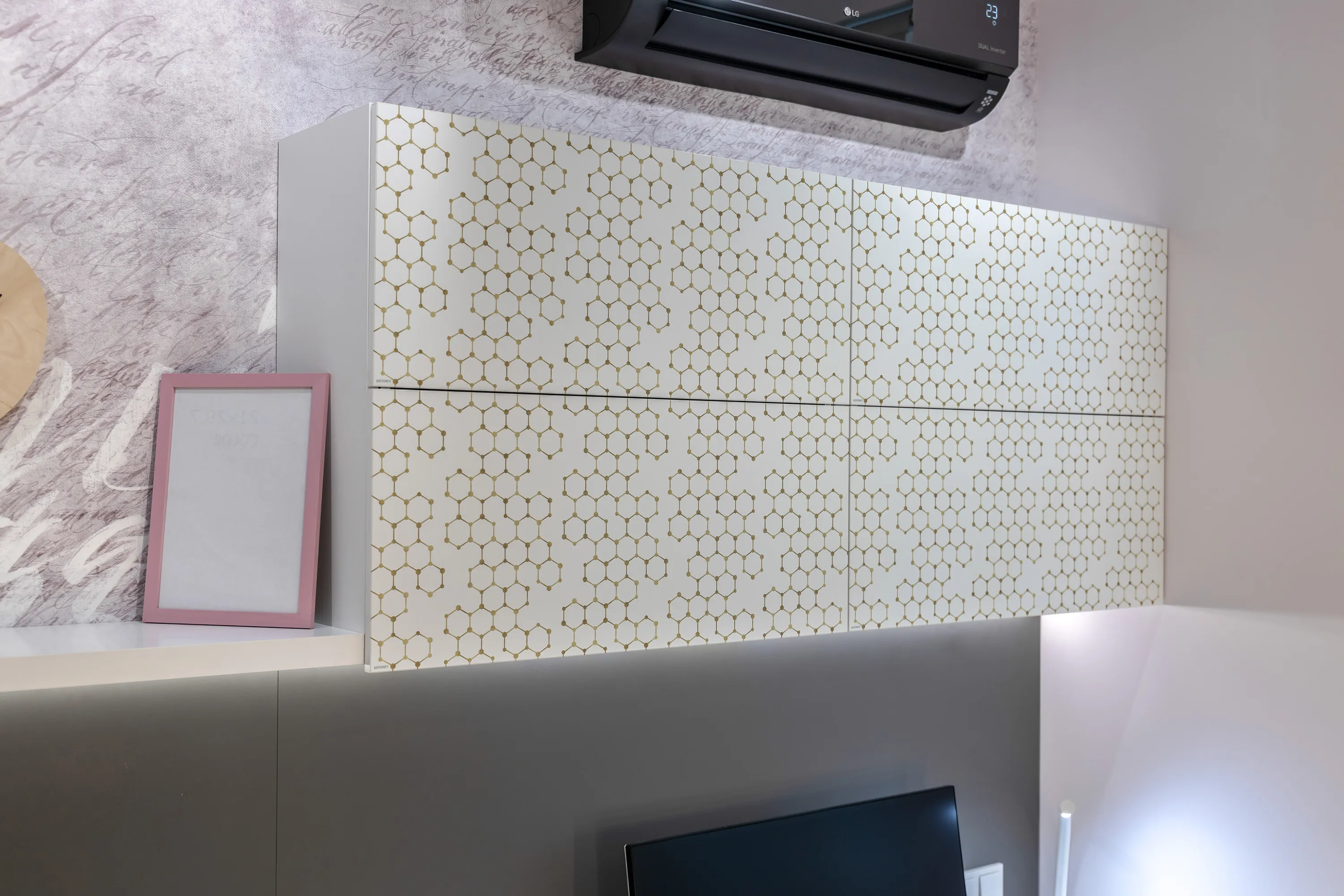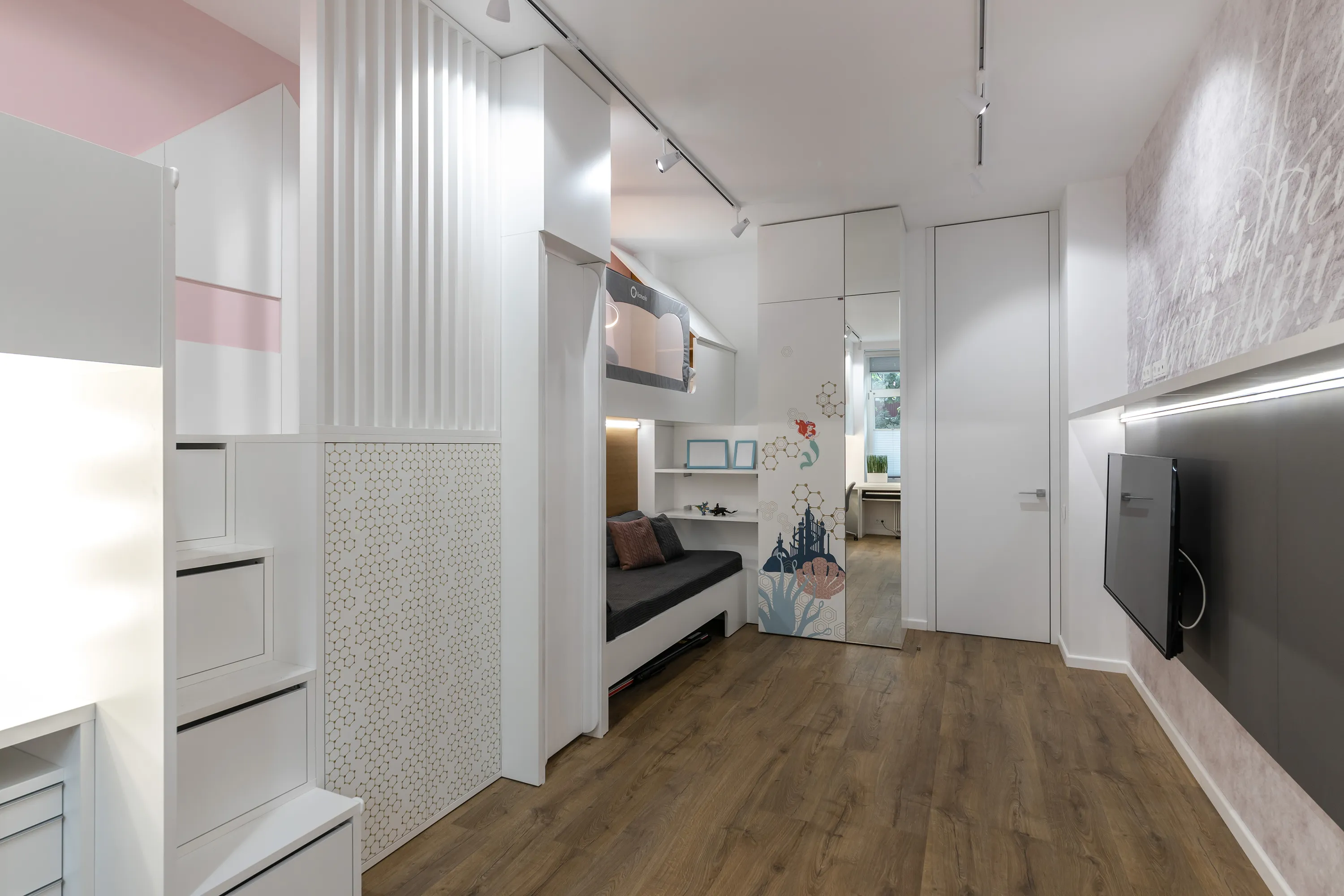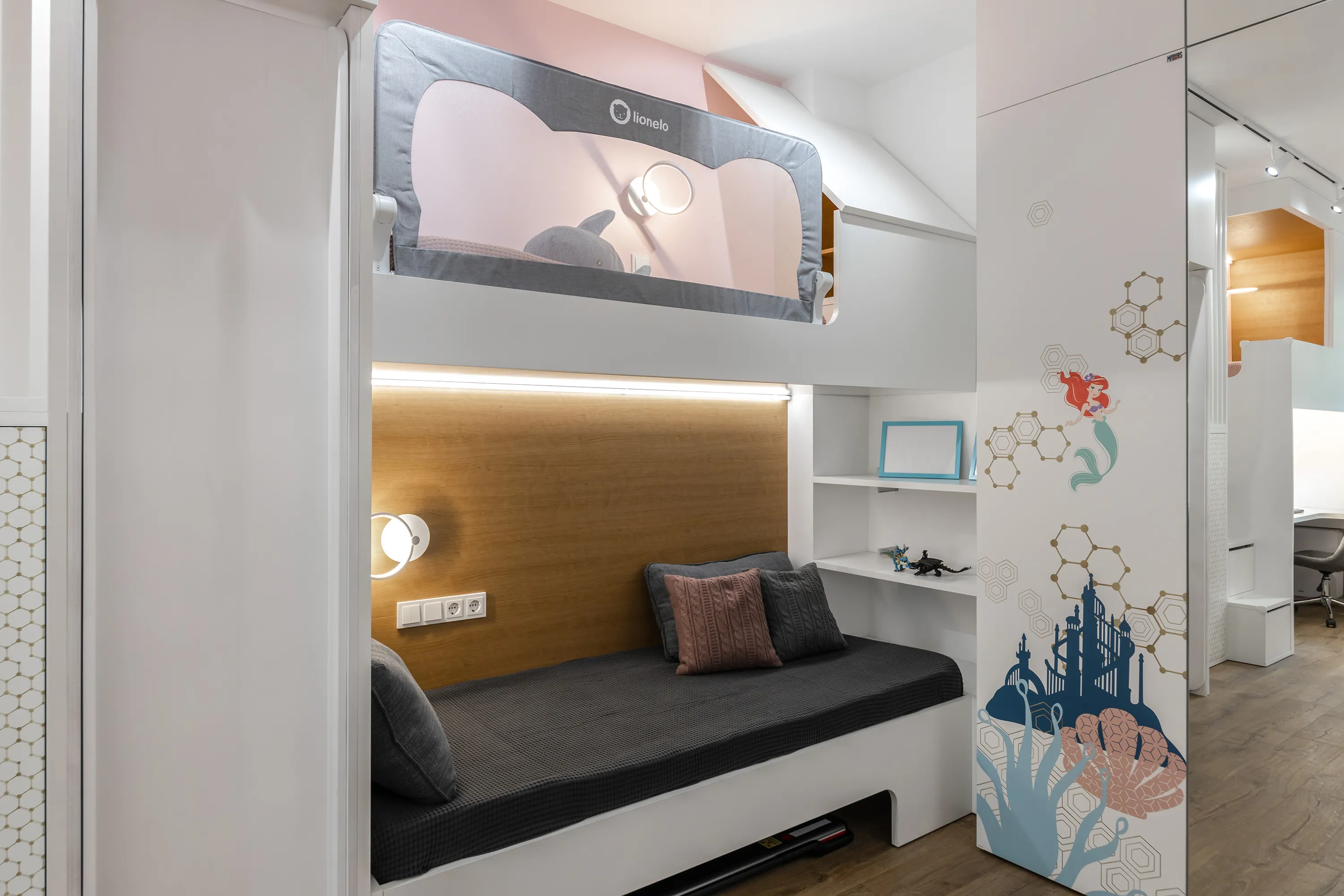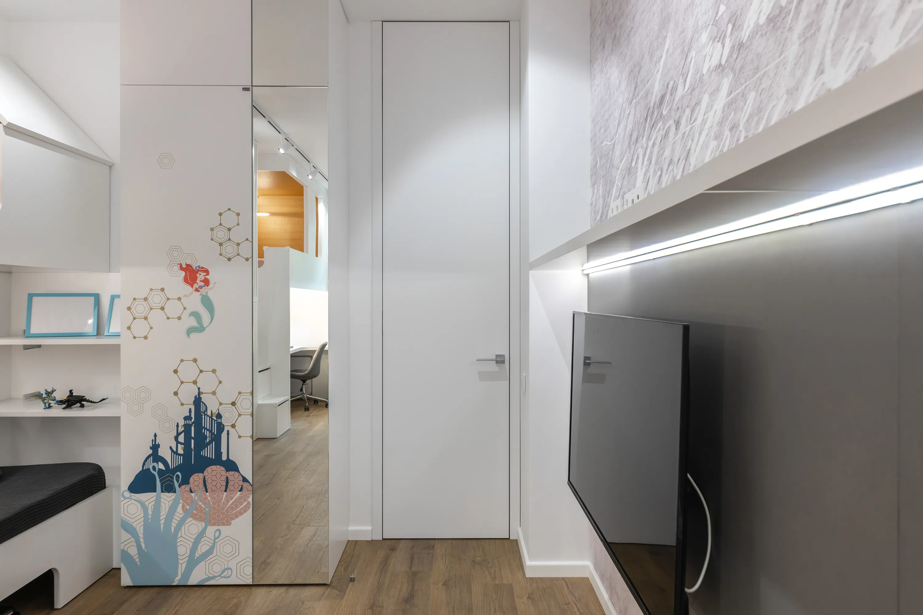Главными акцентами в проекте, помимо сложности конструкций, являются монопринт с изображением Русалочки и подводного мира, а также принт-паттерн (повторяющийся шаблон в той же тематике), напоминающий золотистые морские сети, на дверцах шкафов и складных (откидных вверх) фасадах навесных элементов рабочего места. Печать изображений на мебели позволила не только украсить мебель, но и придать всей комнате уникальный вид. Наши герои могут быть уверены, что такой комнаты больше ни у кого не будет!
