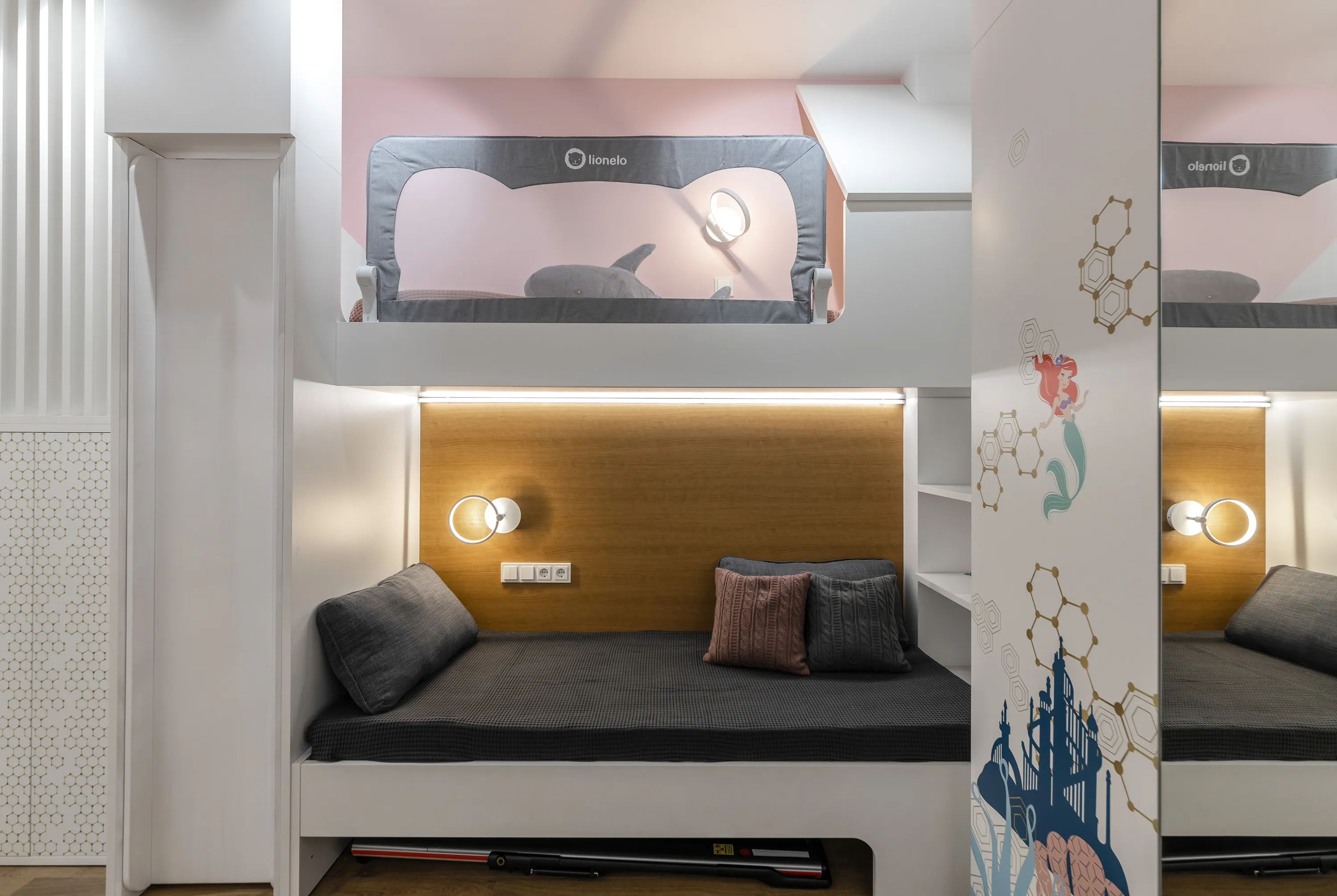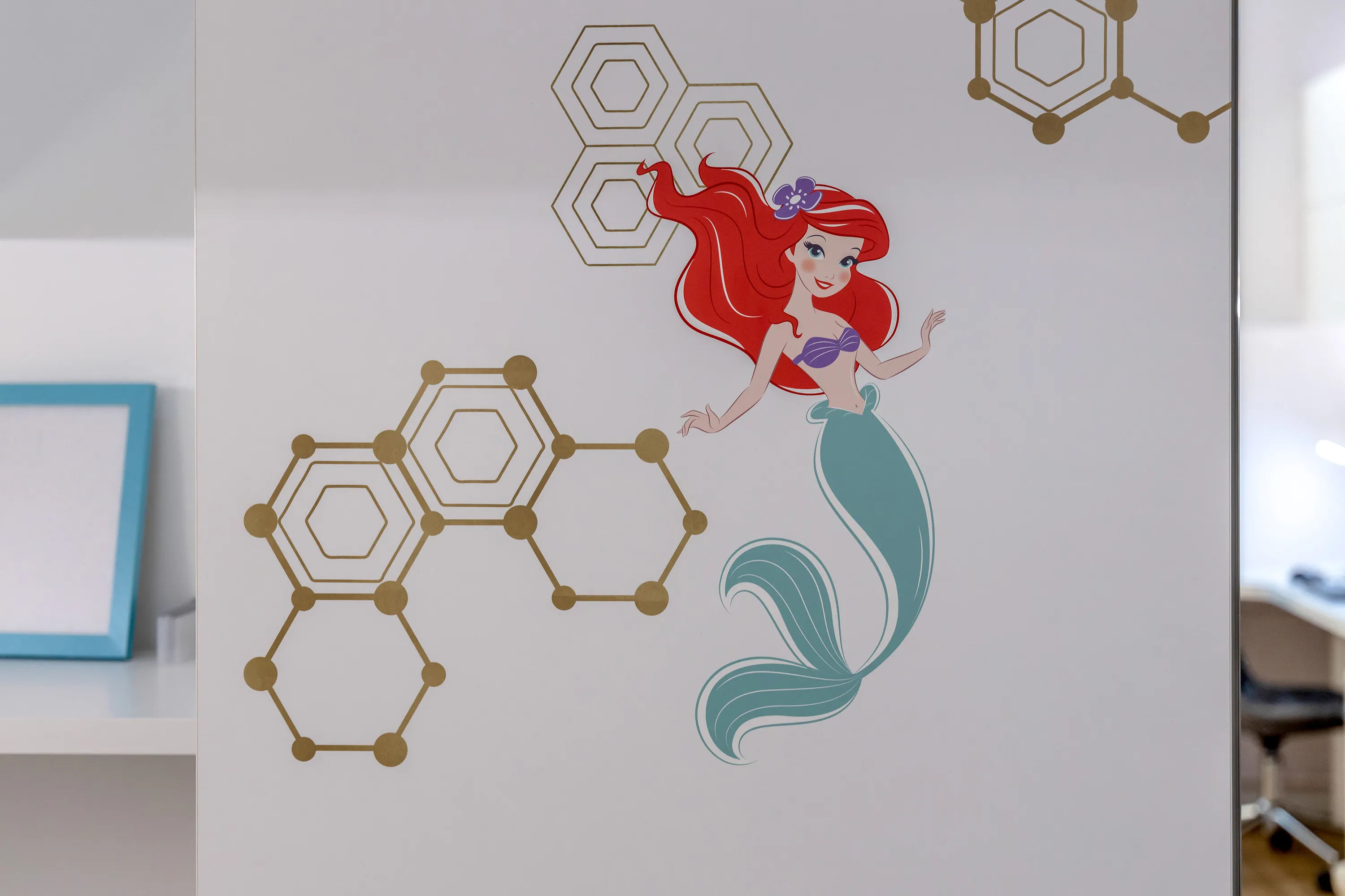 В проекте использованы принты с изображением принцессы Ариэль – знаменитой героини анимационного фильма «Русалочка». Изображения напечатаны на производстве компании Mr.Doors прямо на мебели методом ультрафиолетовой печати с помощью промышленного принтера. Такие изображения не стираются и не тускнеют под действием солнечных лучей.