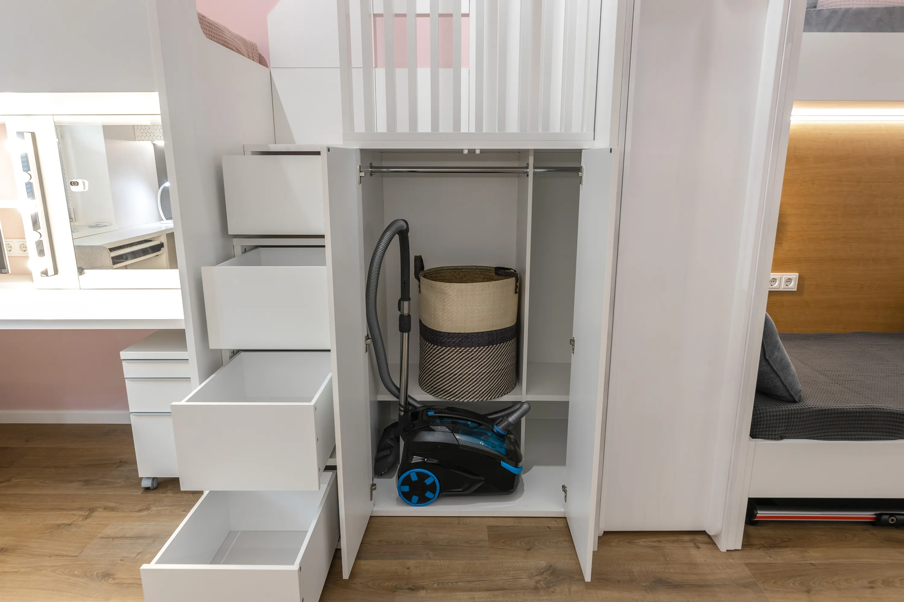 Между кроватями разместили платяной шкаф, которым будет очень удобно пользоваться младшему члену семьи.
