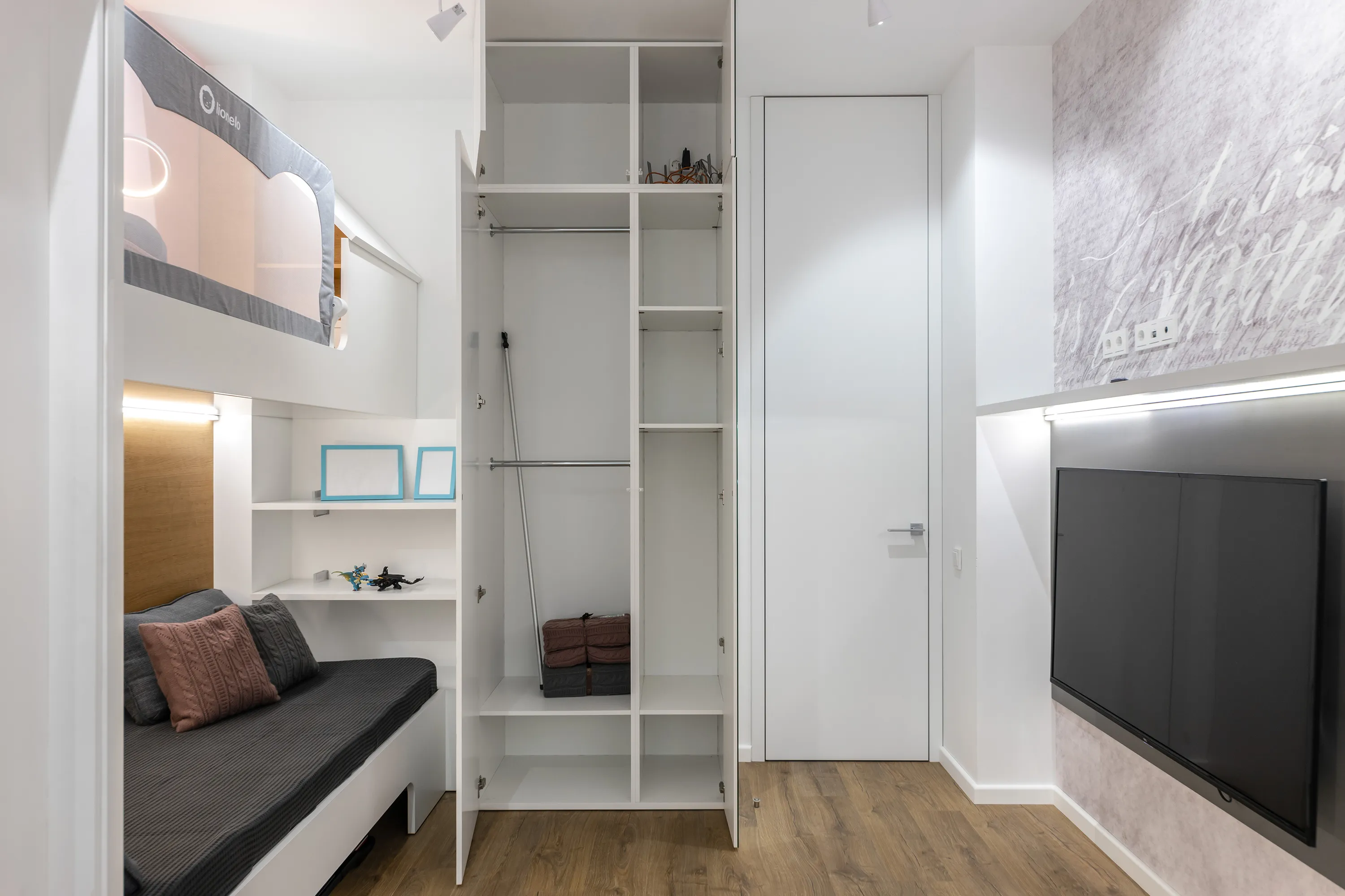 Наполнение комнаты: вместительные гардеробные шкафы, двухуровневые кровати, письменный стол и модули для хранения книг и игрушек. Мебельная конструкция получилась весьма сложной в изготовлении, но специалисты Mr.Doors, как всегда, справились с поставленной задачей.