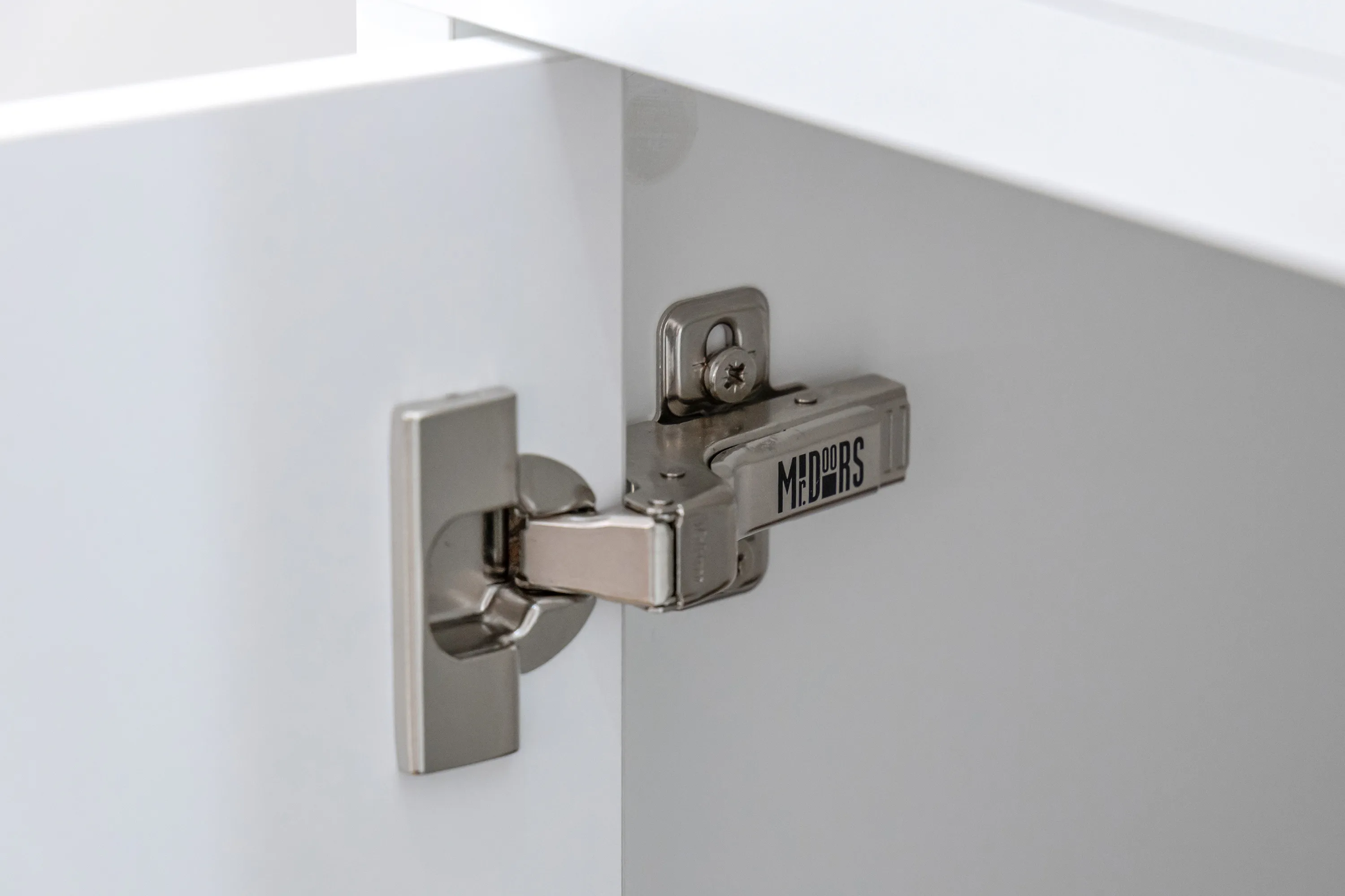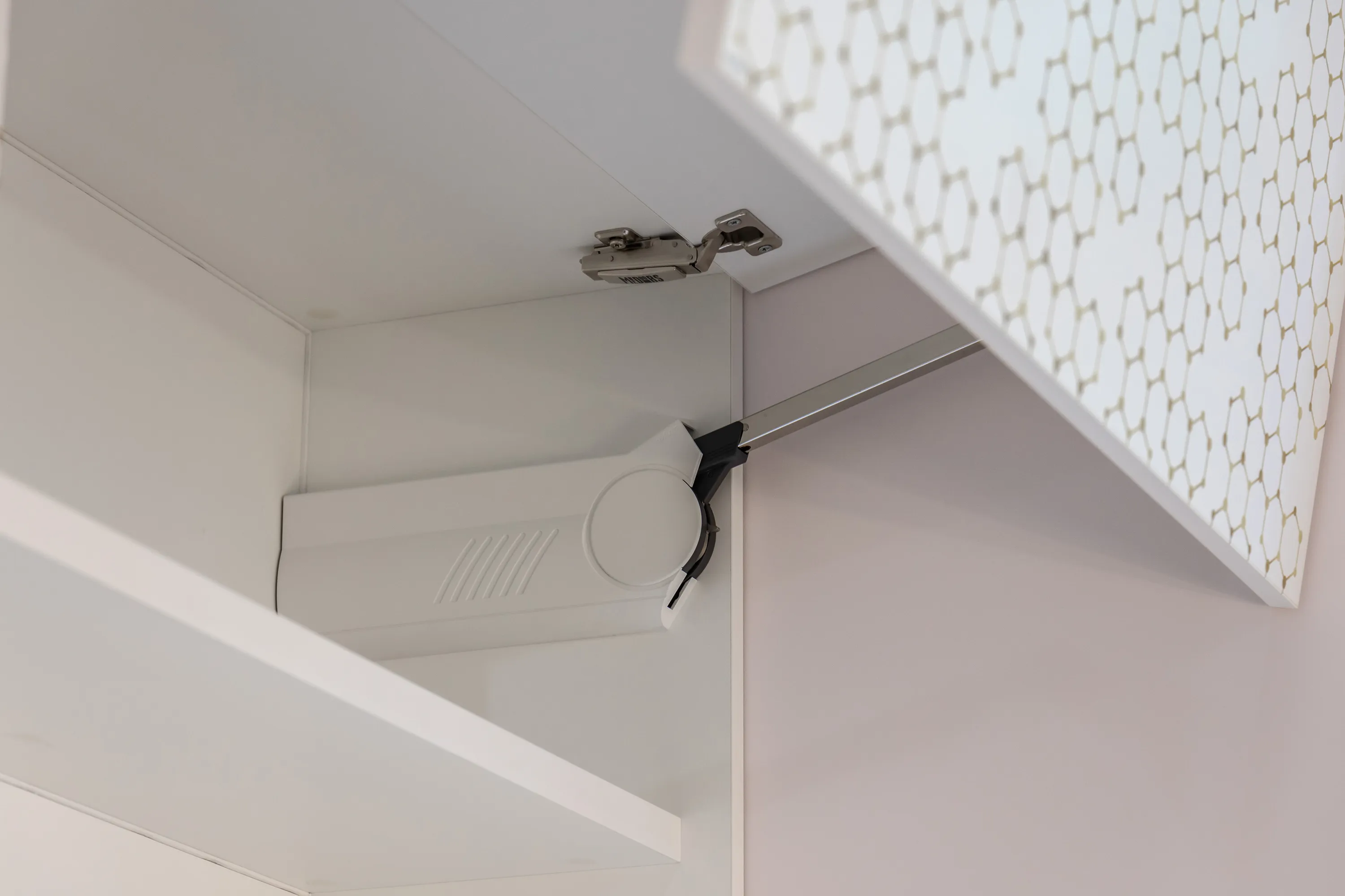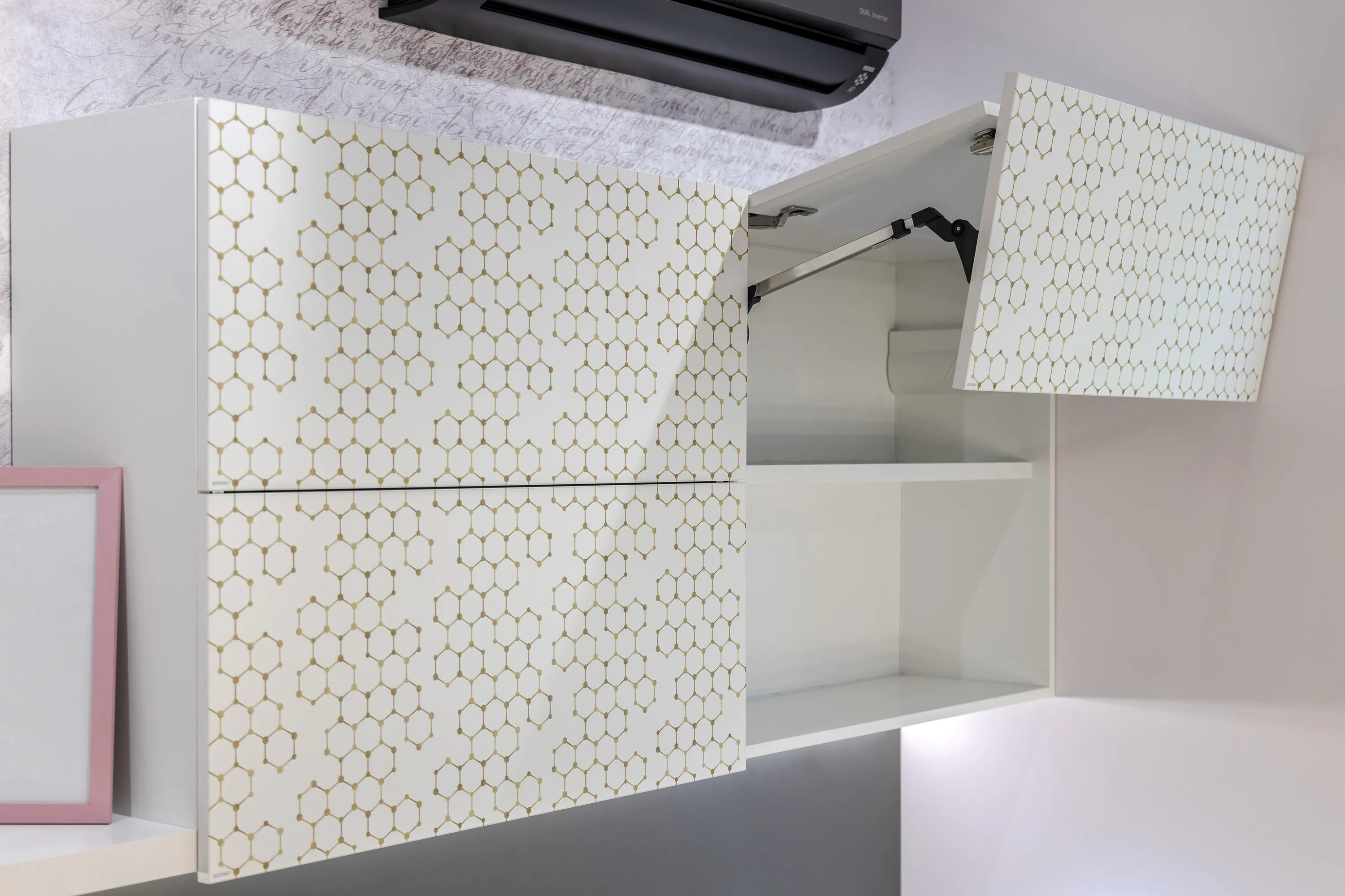 Фасады модулей на стене – складные и открываются вверх. С ними легко справится ребенок, они очень удобны в эксплуатации. Все фасады в проекте открываются при помощи системы Р2О (Push-To-Open / нажал-открыл).