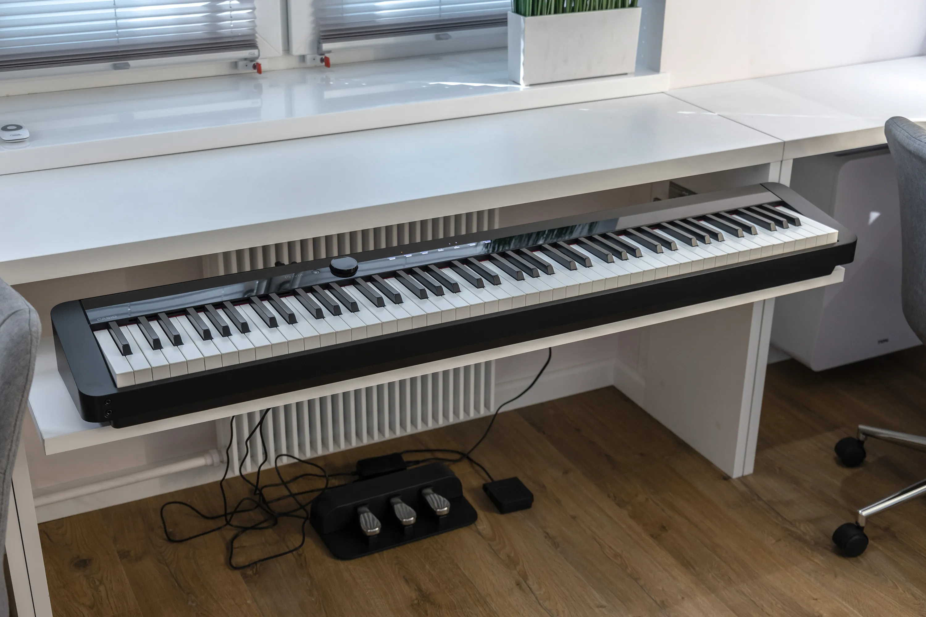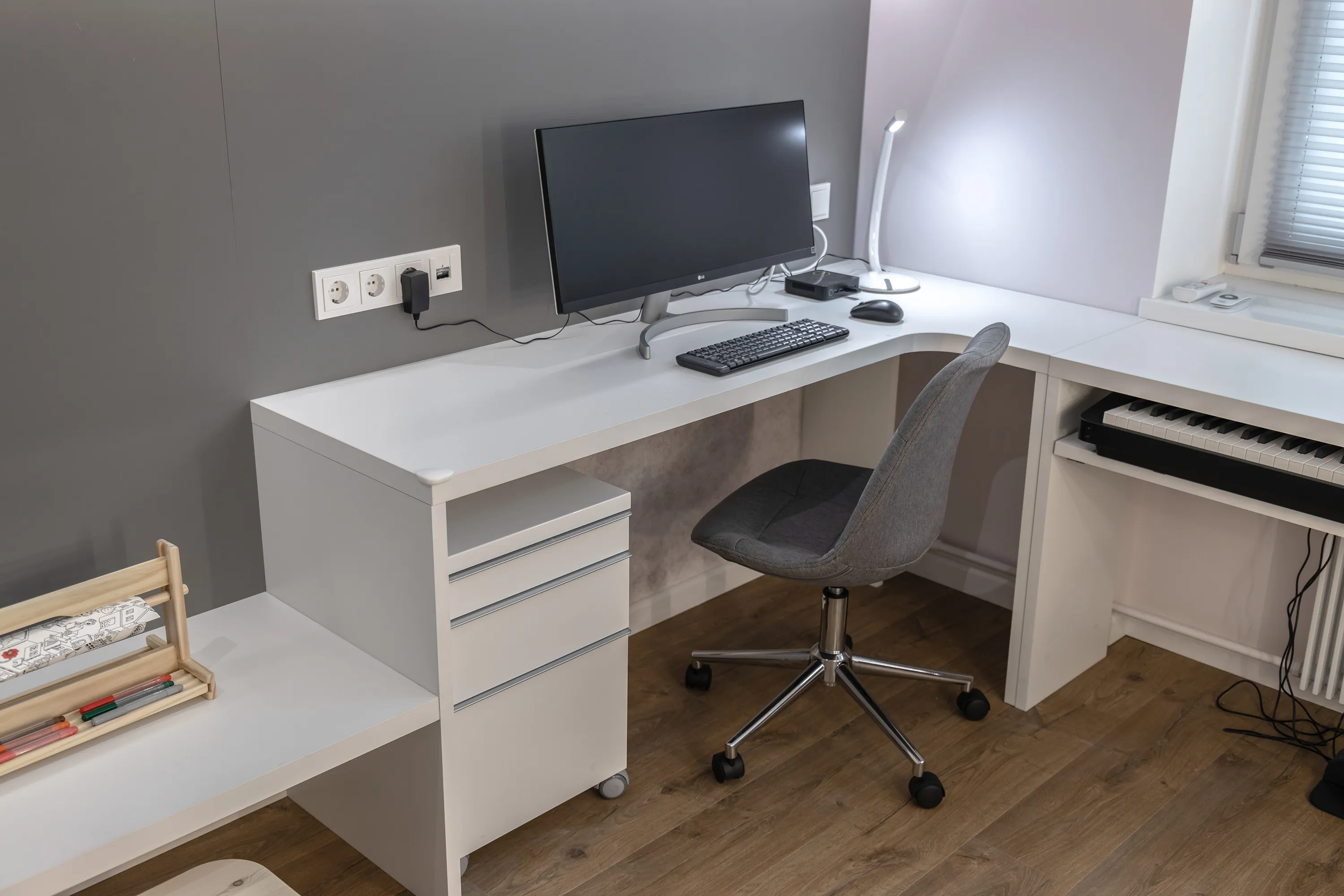 У окна с переходом на противоположную от спальных мест стену устроили еще одно рабочее место. Под столом у окна установлена выдвижная полка для расположения синтезатора. Оба стола для удобства снабжены сопроводителями проводов.