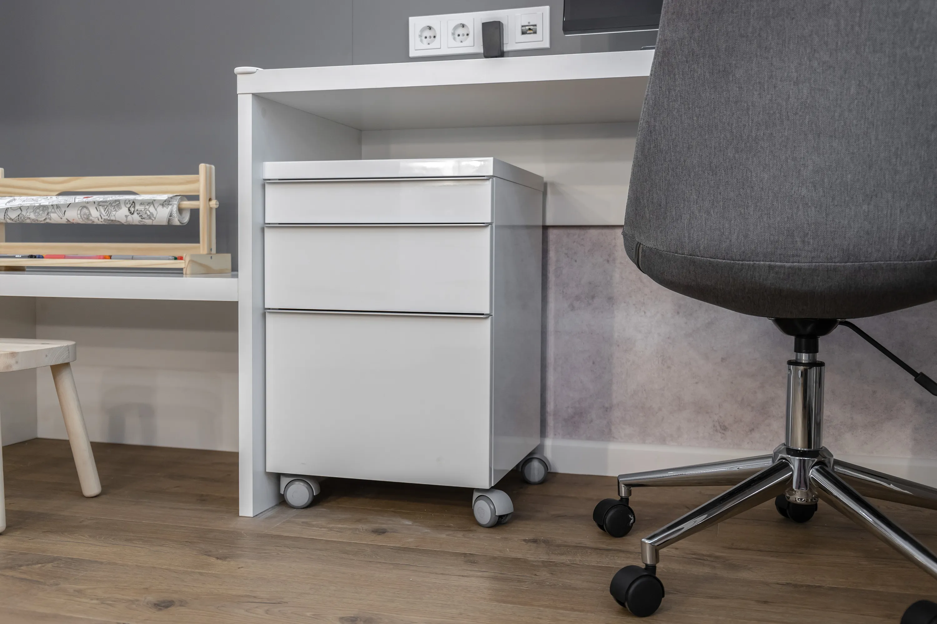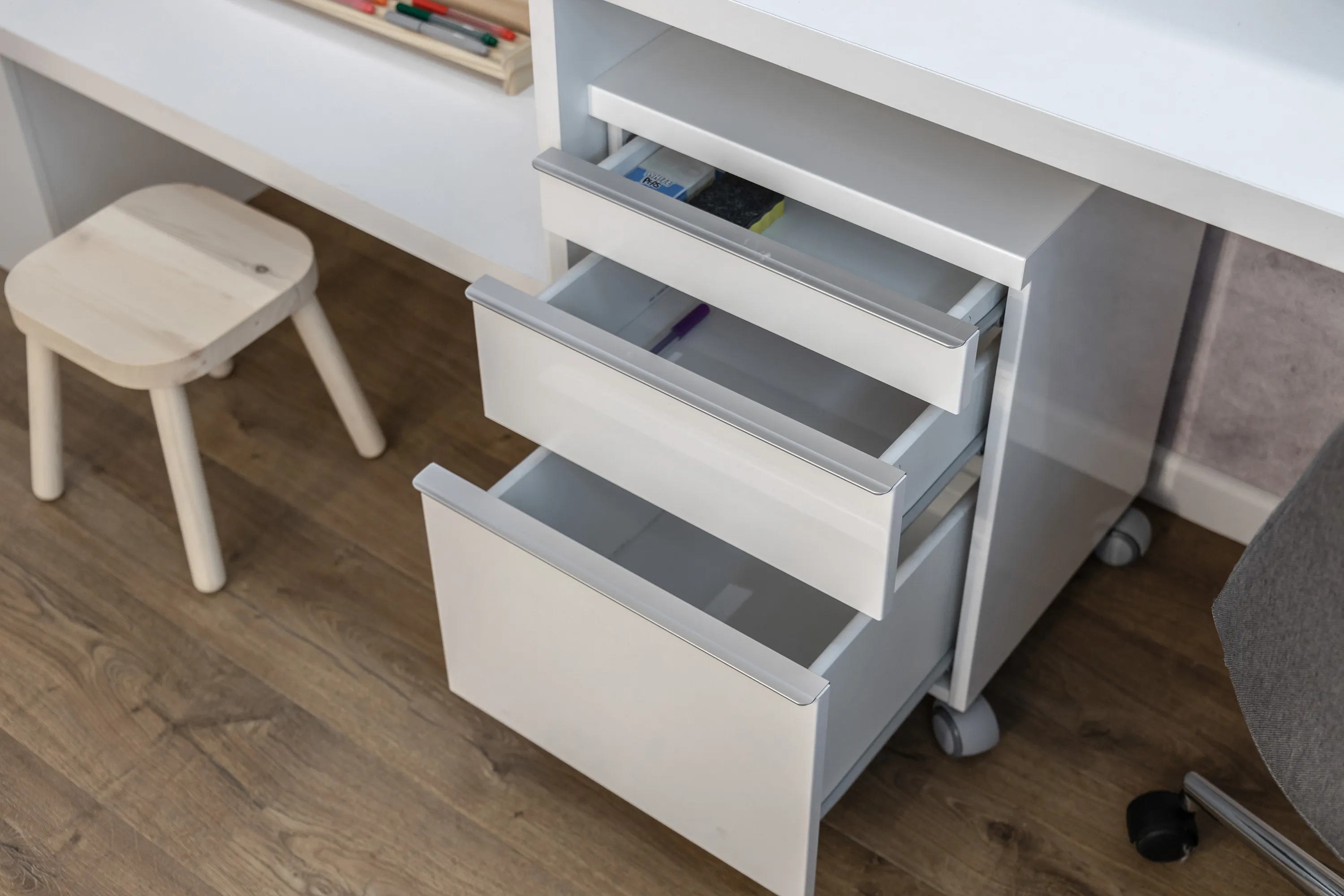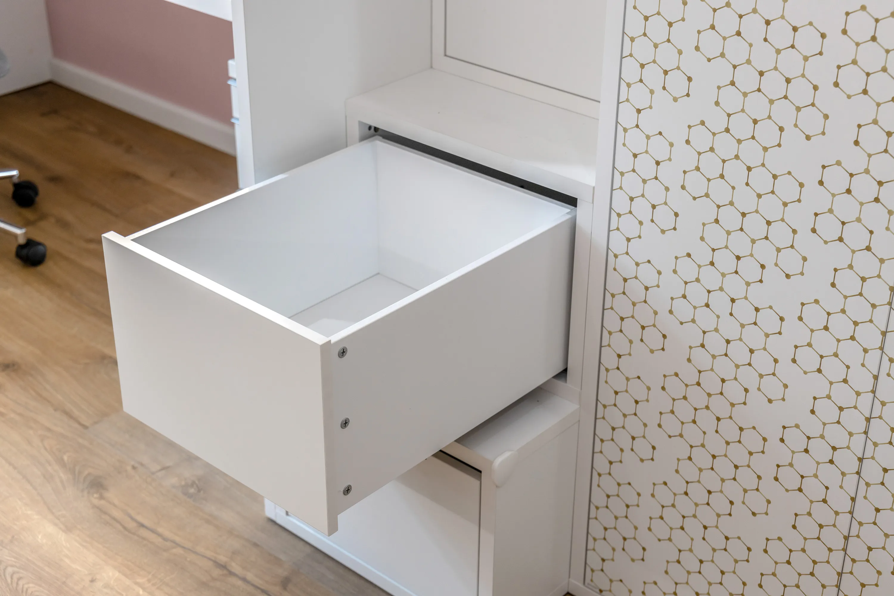 Так как в комнате размещено довольно много мебели, мы решили использовать светлые декоры, чтобы визуально придать комнате воздуха и объема. Основной декор всех элементов – ламинированная плита «Белый Премиум» различных толщин. Данный материал имеет европейский сертификат экологической безопасности, абсолютно безвреден и идеально подходит для детской мебели.