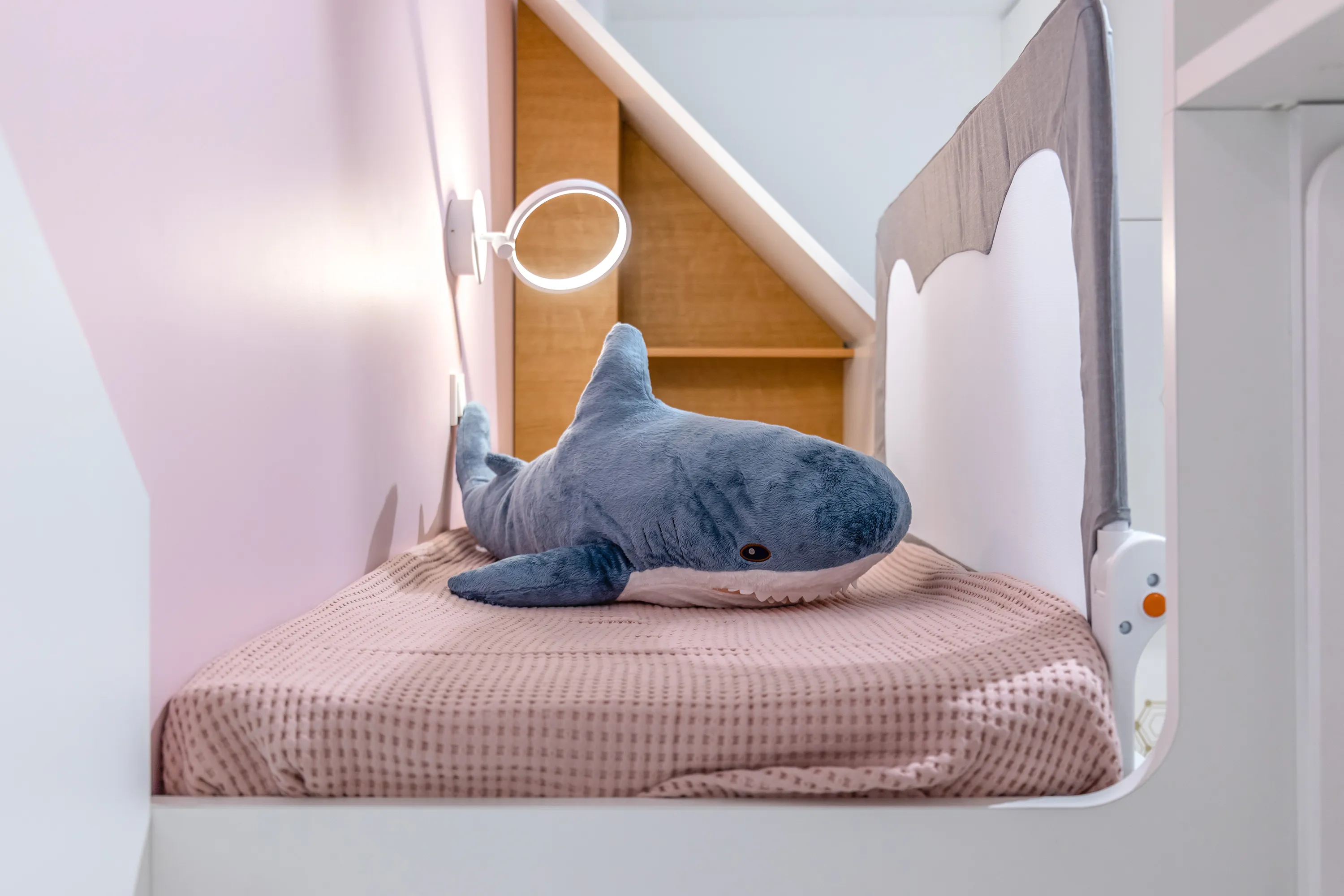 Лестница, состоящая из четырёх ящиков с направляющими полного выдвижения и доводчиками, ведет маленьких хозяек на двухъярусные кровати с детскими матрасами Kids Comfort. Эта модель особенно хорошо подойдет школьникам, чей вес более 20 кг. В этом случае пружины будут правильно воспринимать нагрузку и оказывать должный анатомический и ортопедический эффект.