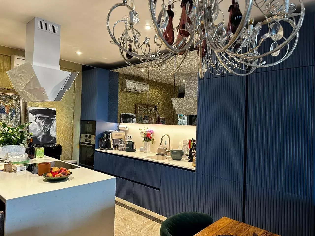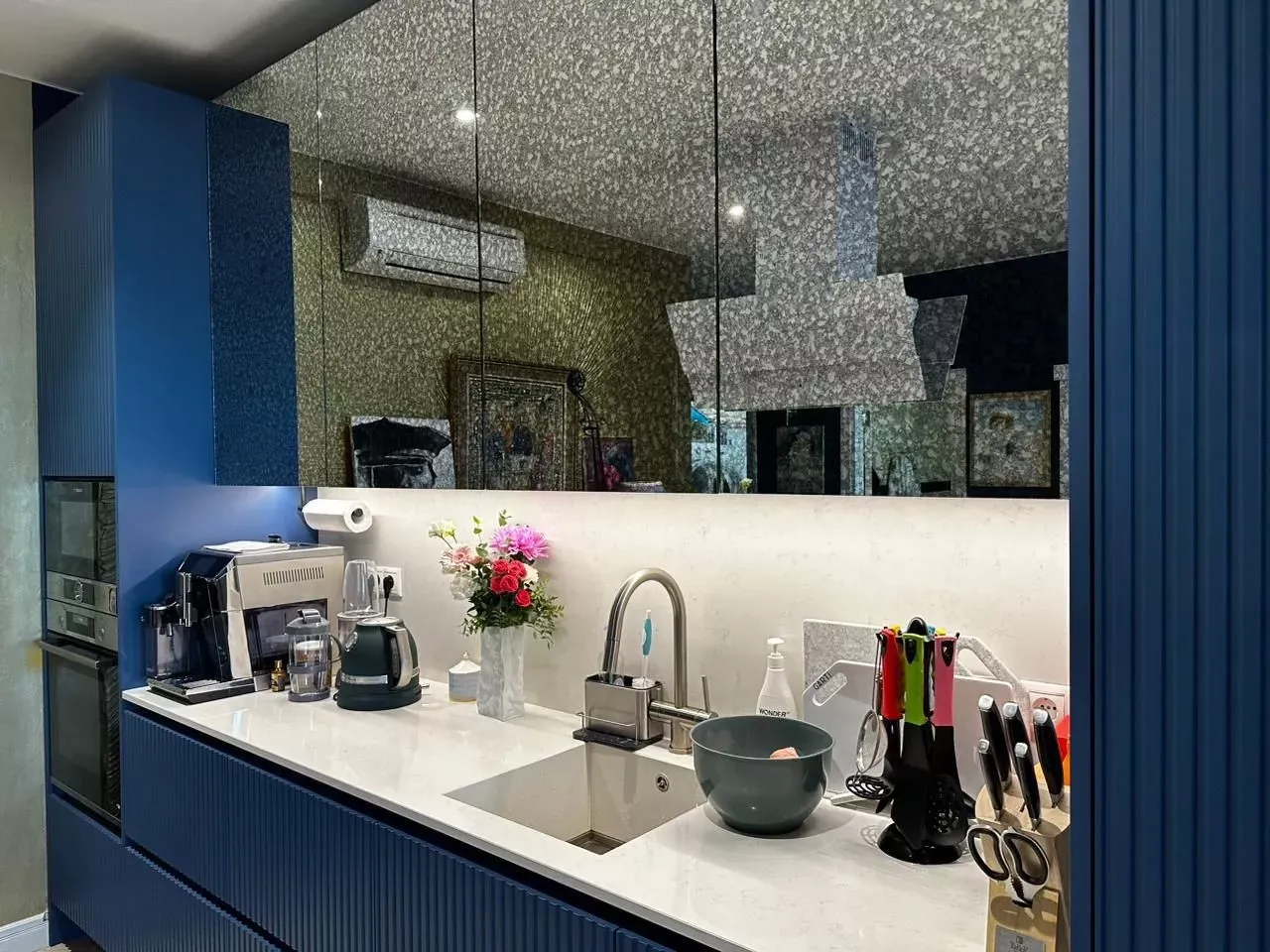 Кухня выполнена в минималистичном стиле с акцентом на функциональность и комфорт. Фрезерованные фасады насыщенного синего цвета в контрасте с белой столешницей и светлыми элементами интерьера добавляют пространству глубины и изысканности.