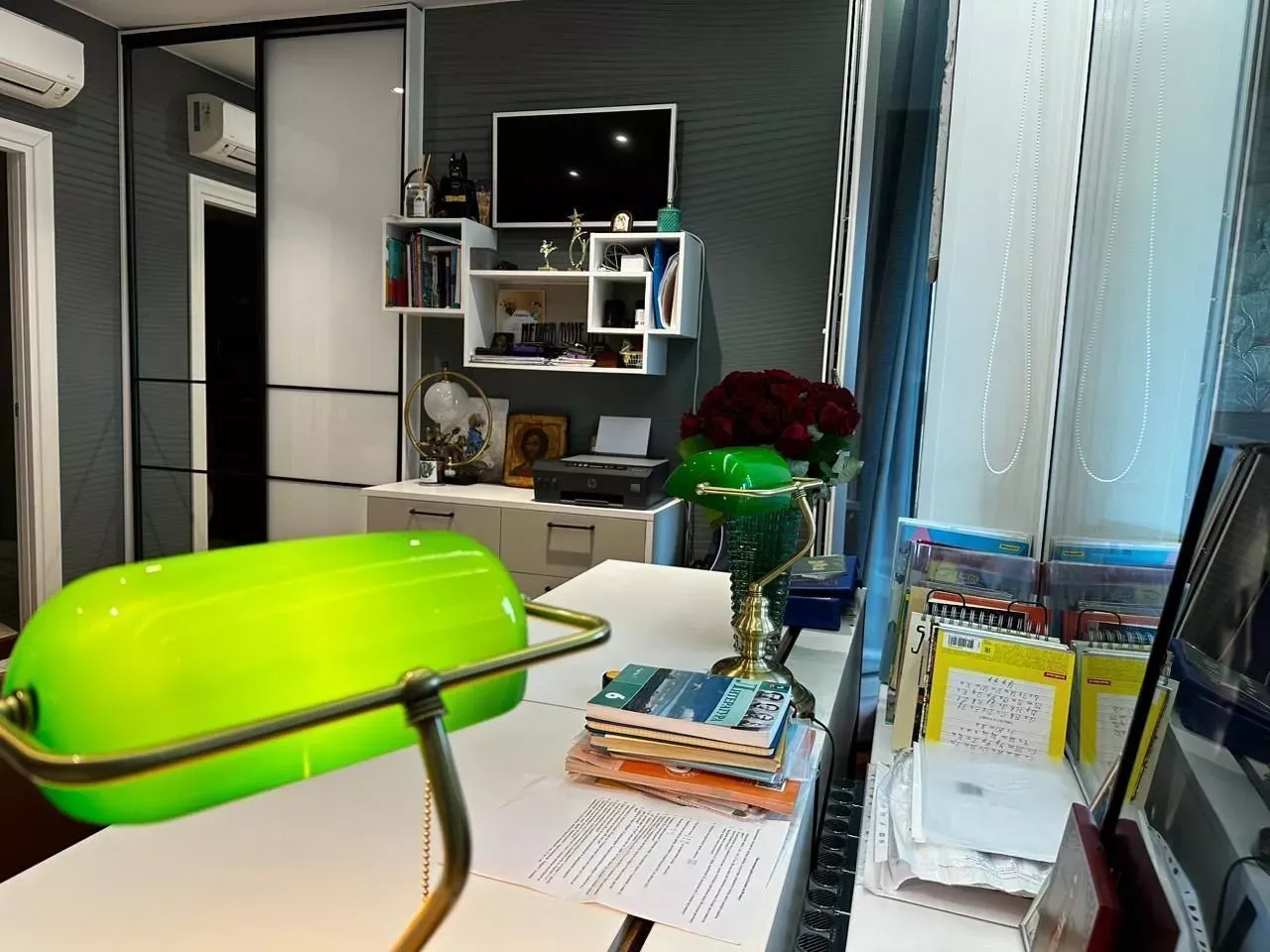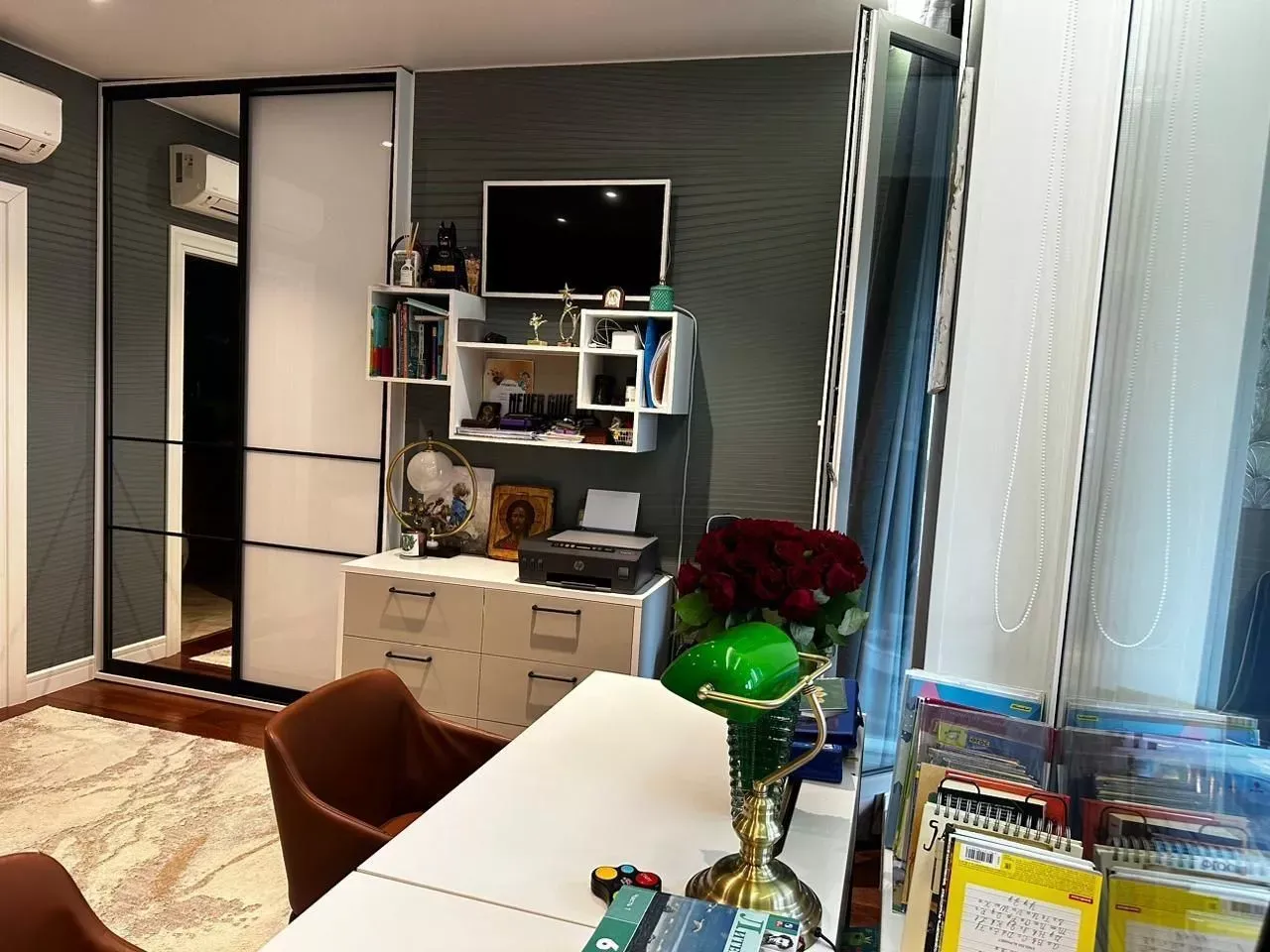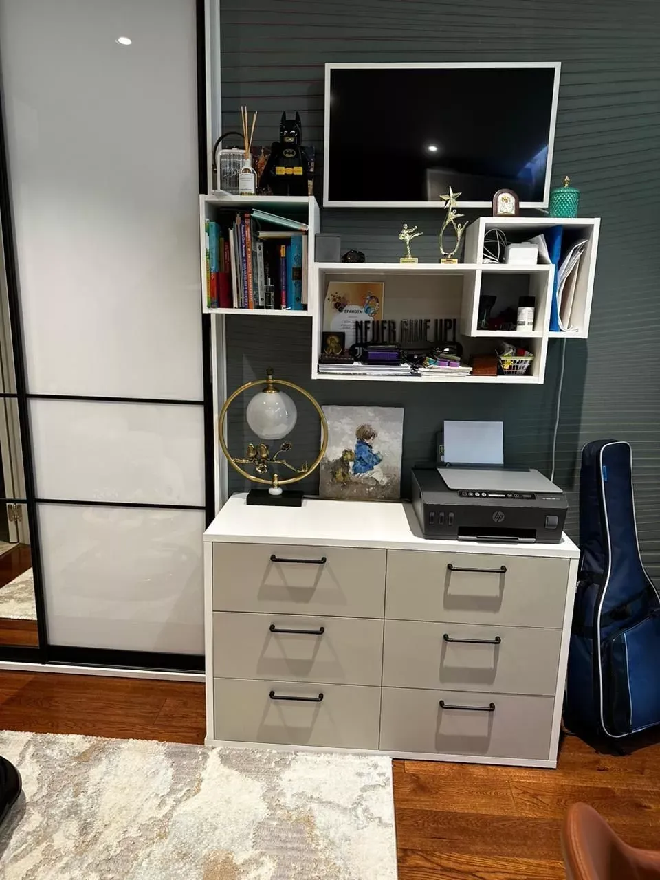 В качестве рабочего места используется единая столешница, на которой можно легко разместить два монитора. Для хранения канцелярии и важных мелочей под столешницей предусмотрены выдвижные ящики. Подвесные полки, тумба и встроенный шкаф-купе дополняют систему хранения и позволяют легко поддерживать порядок в комнате.