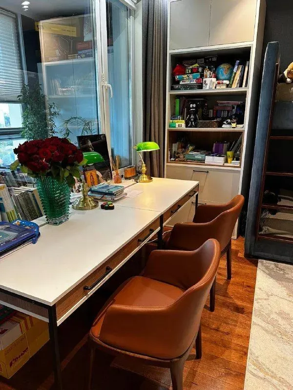 Комната выглядит уютной и функциональной с хорошей организацией пространства для обучения и творчества двоих детей.