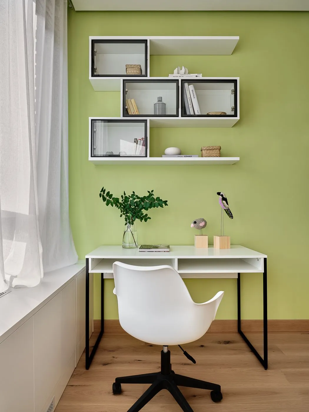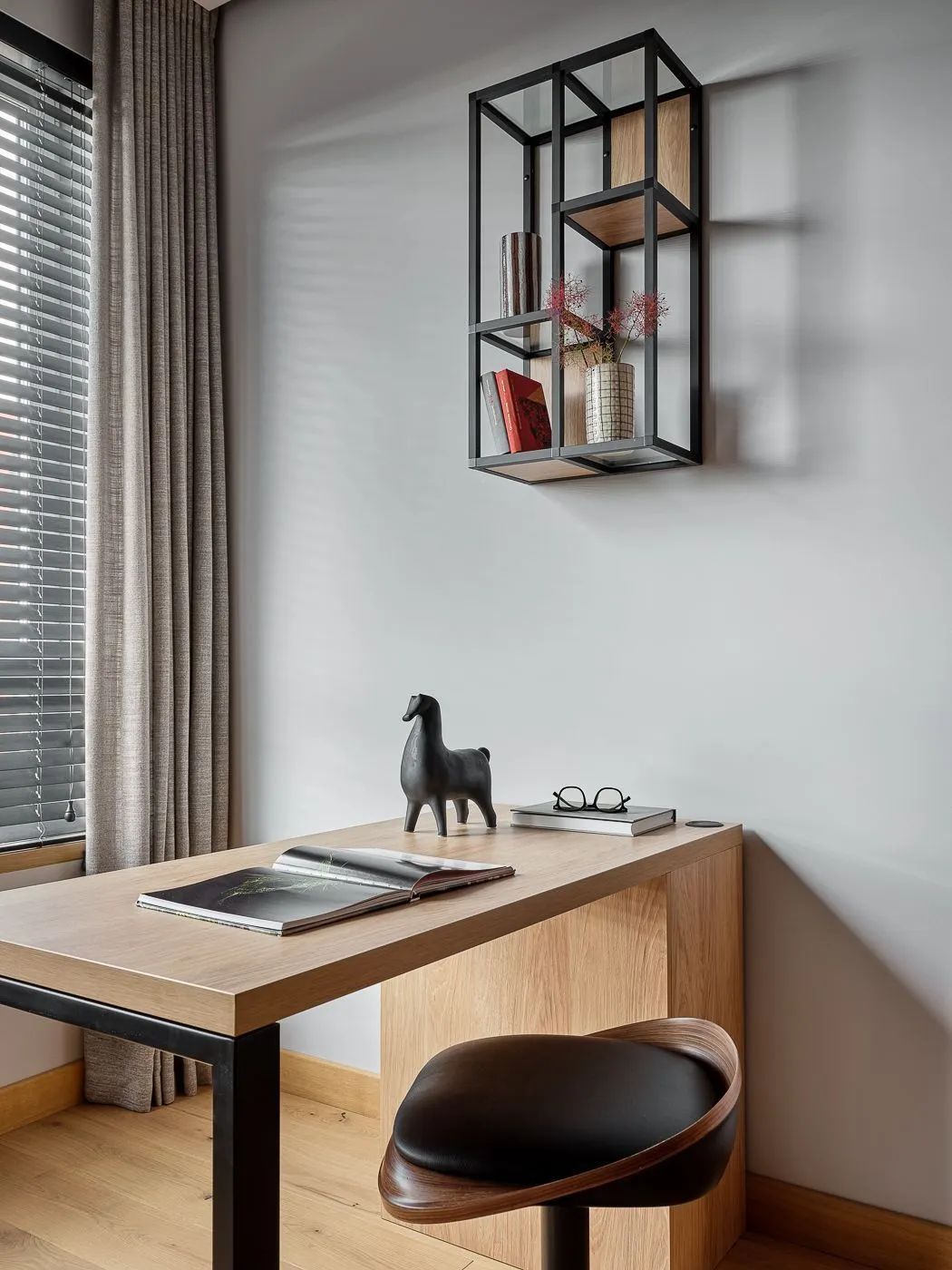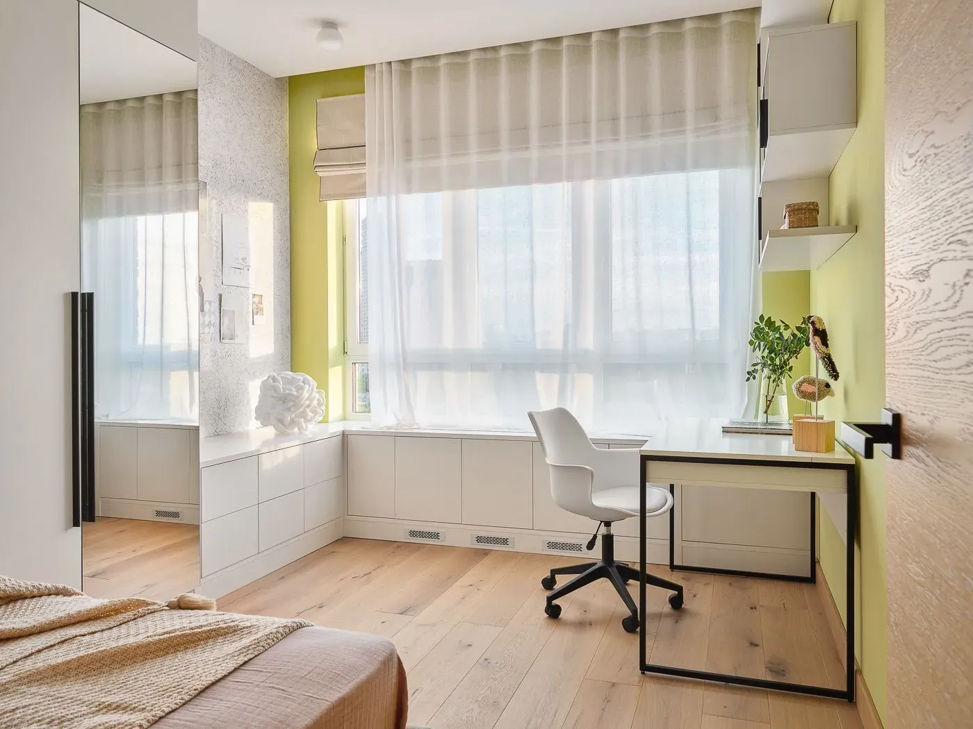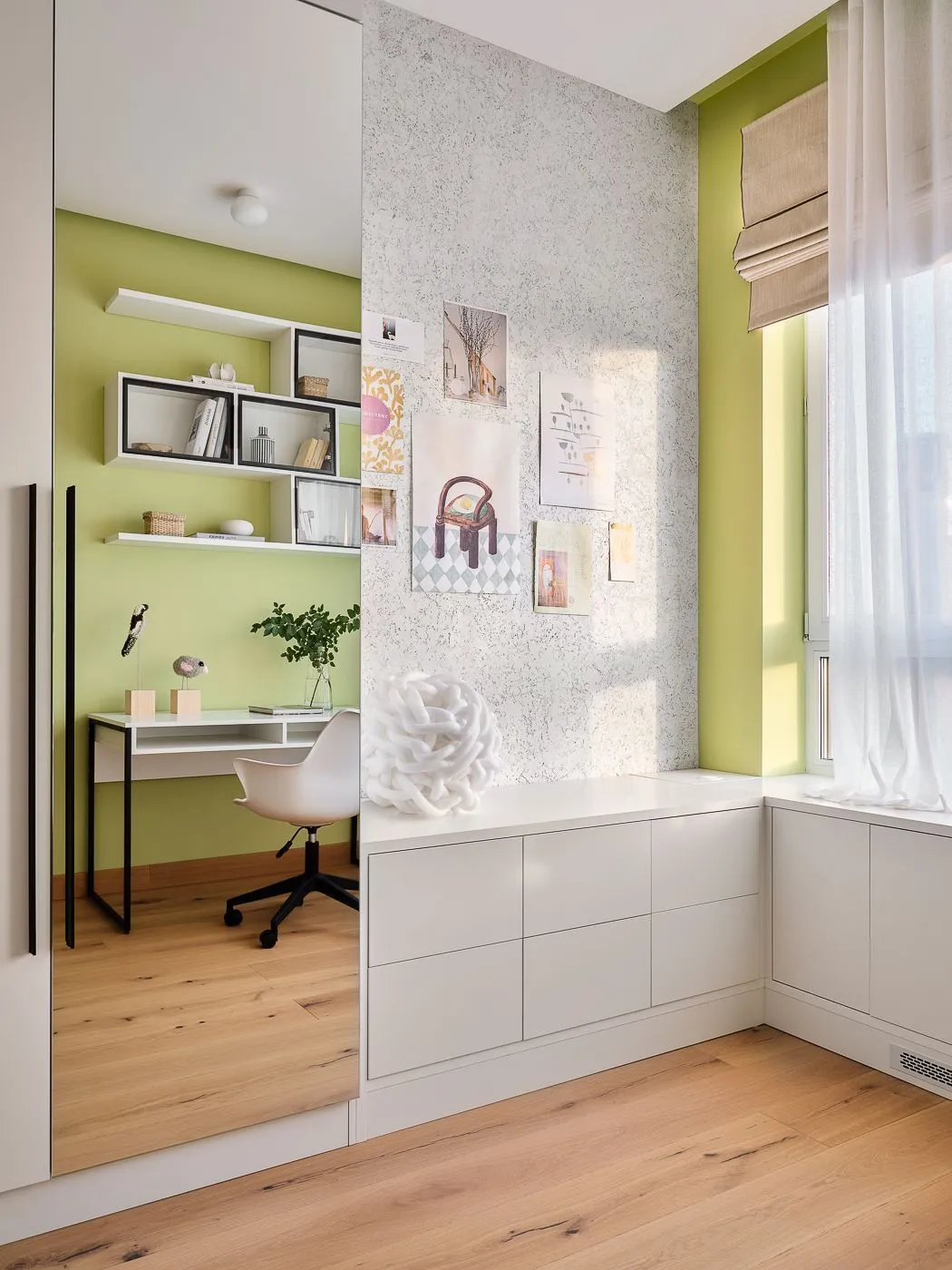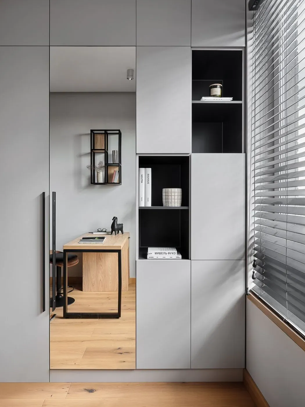 Система хранения продумана максимально детально: выдвижные ящики, антресоли, секции, дверца даже под письменным столом — решение рассчитано до миллиметра совместно с нашим менеджером. Навесная конструкция из открытых и закрытых полок (часть за стеклом) создавалась довольно долго и в итоге получилась лёгкой, динамичной и функциональной. Письменный стол также в декоре «Альбион».
