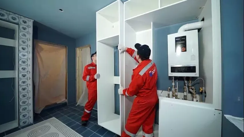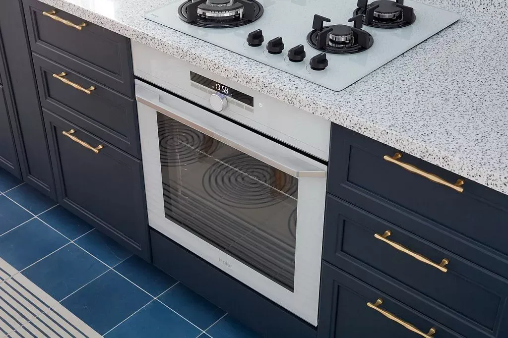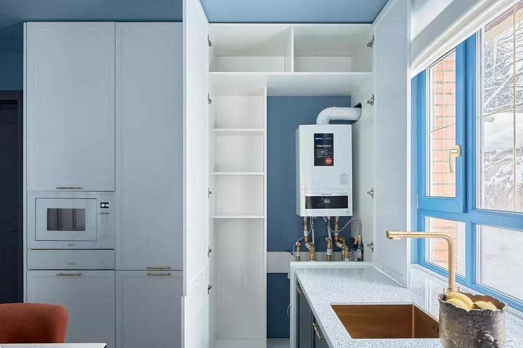 На торцевой стене кухни мы разместили ряд высоких модулей в белом цвете. Их украшают филенчатые фасады той же серии «Урбан», что и на тумбах рабочей зоны — тоже из МДФ, но в плёнке ПВХ белого цвета. В этих модулях расположены холодильник, встраиваемая СВЧ-печь и ящик для подогрева посуды, а в самом углу композиции внутри модуля установлен водонагревательный котел.