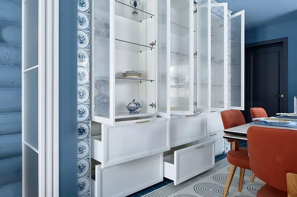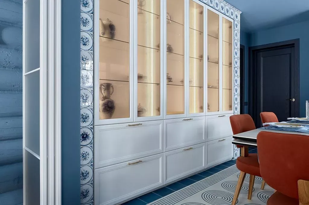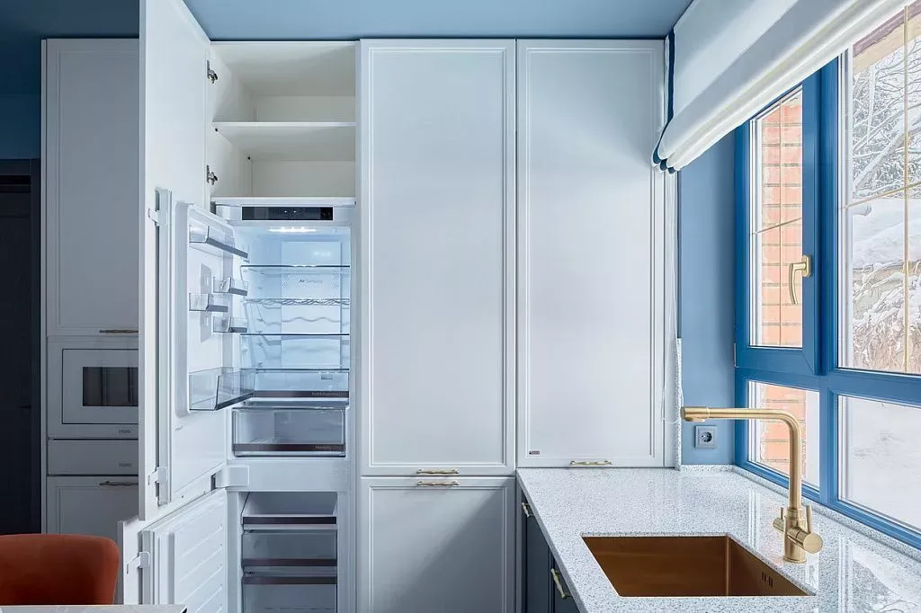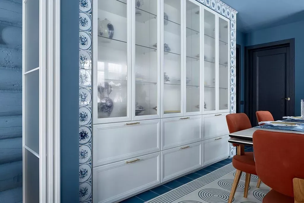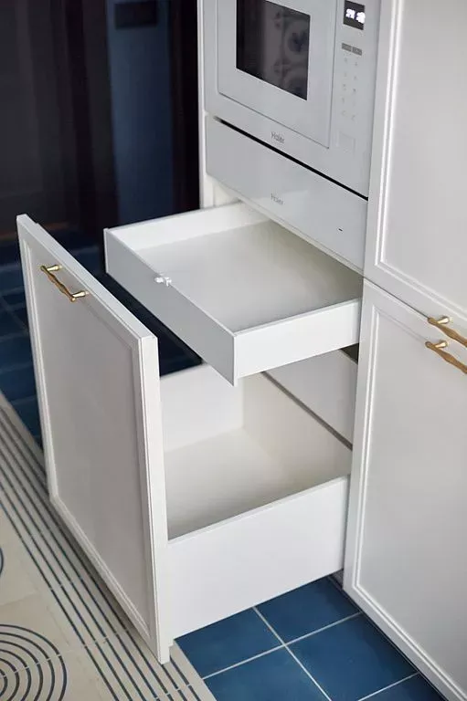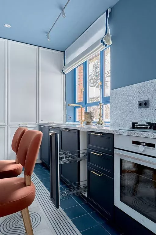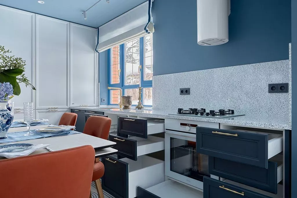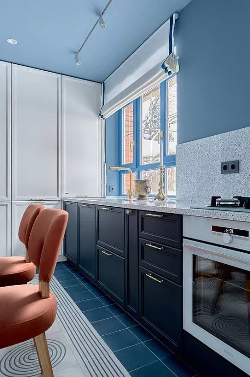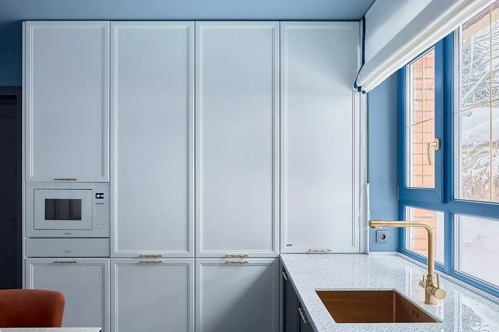 Цвет фасадов этой части кухни был тщательно подобран под цвет напольной плитки и стен, что позволило нам создать единое пространство. Фасады кухни выполнены из МДФ и окрашены со всех сторон матовой эмалью сложного глубокого синего цвета по RAL 5008.