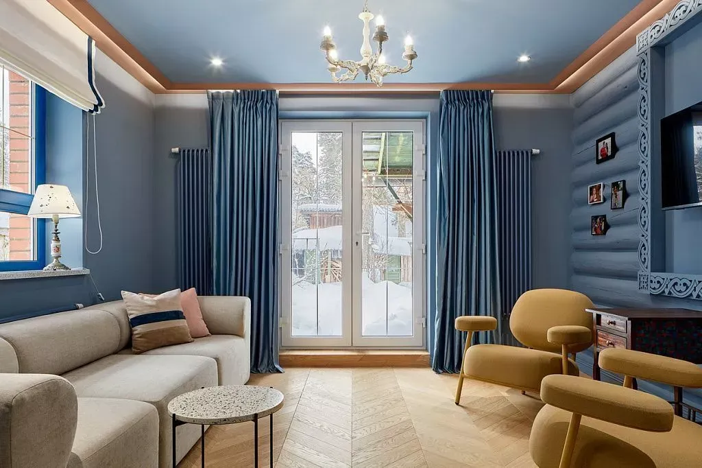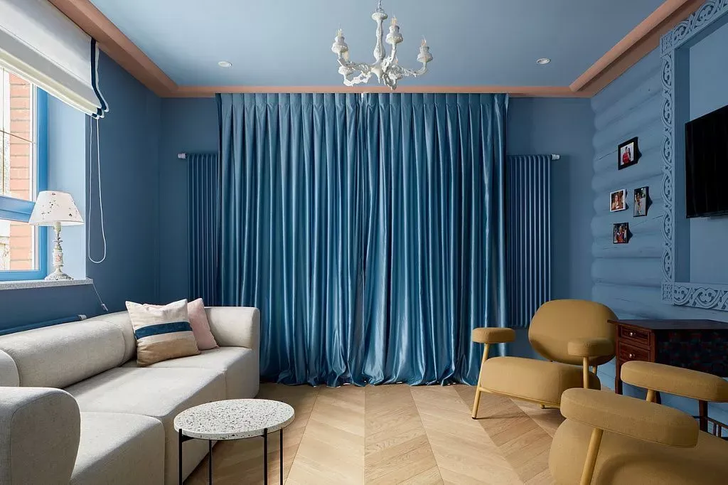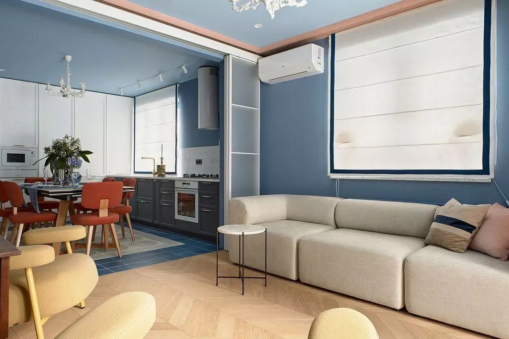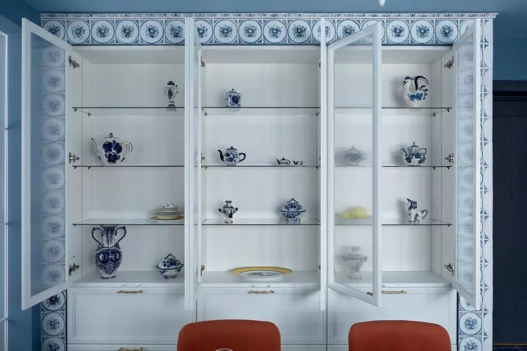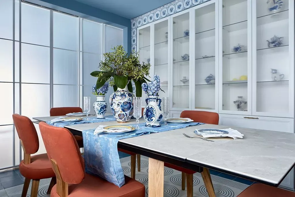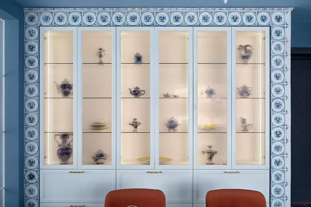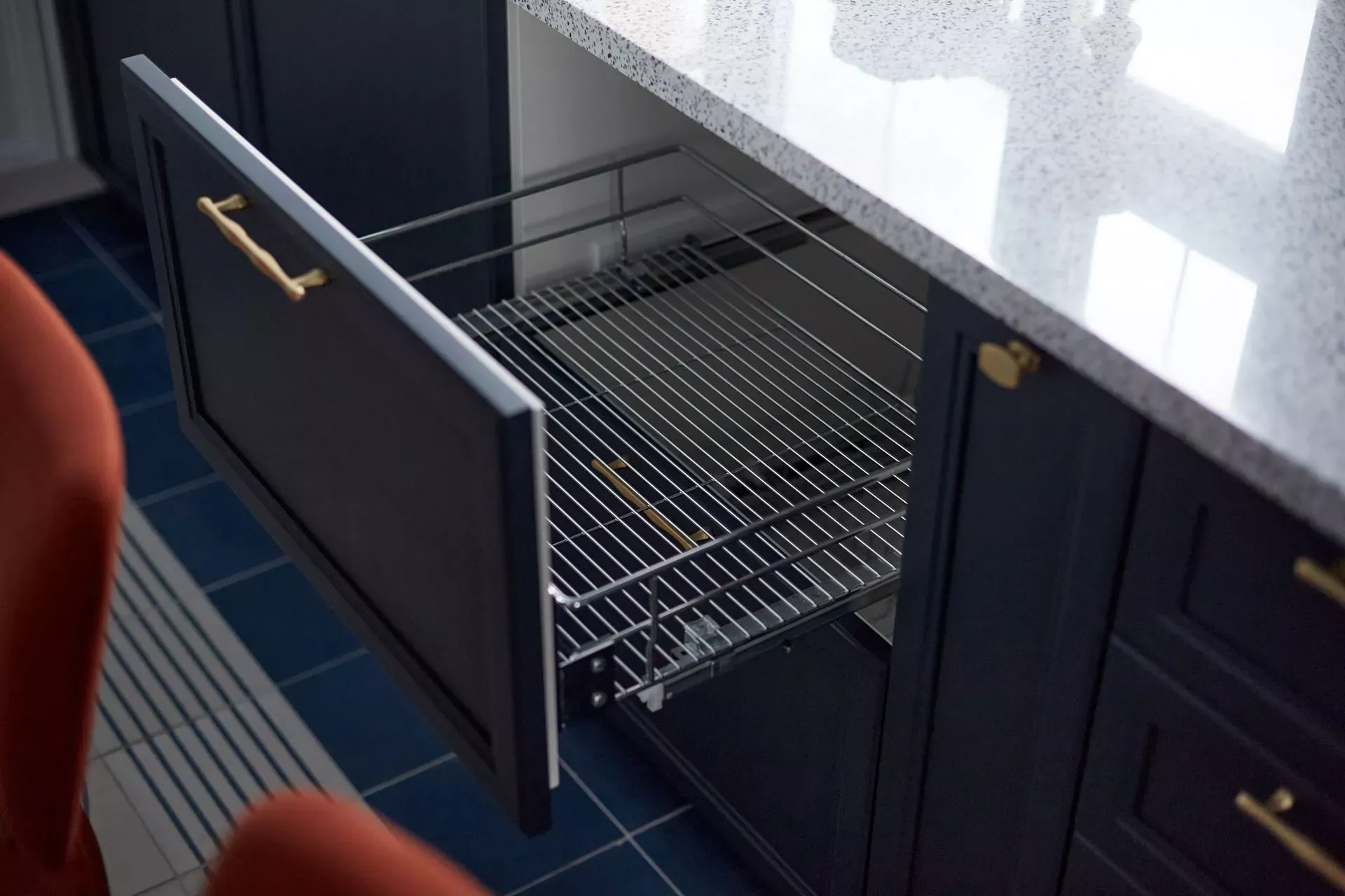 Цвет фасадов этой части кухни был тщательно подобран под цвет напольной плитки и стен, что позволило нам создать единое пространство. Фасады кухни выполнены из МДФ и окрашены со всех сторон матовой эмалью сложного глубокого синего цвета по RAL 5008.