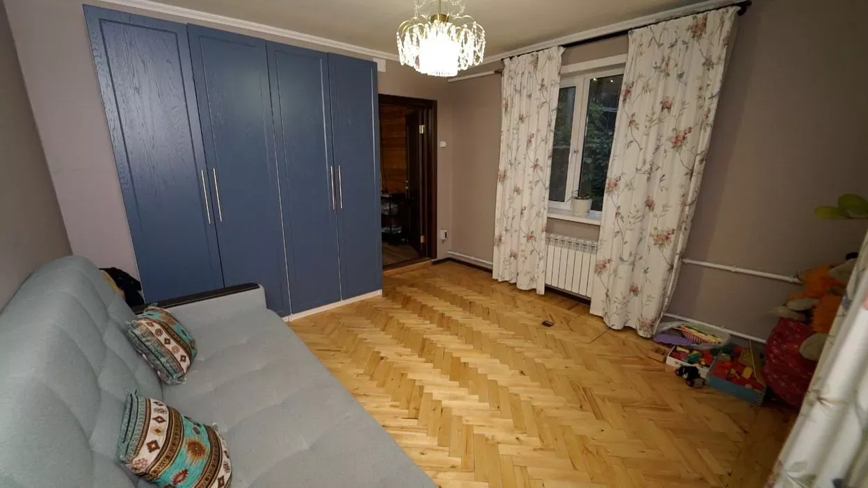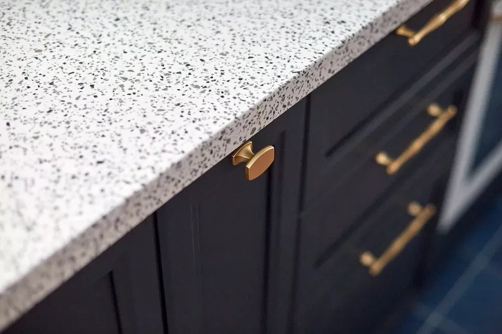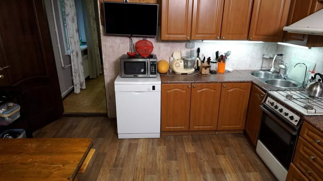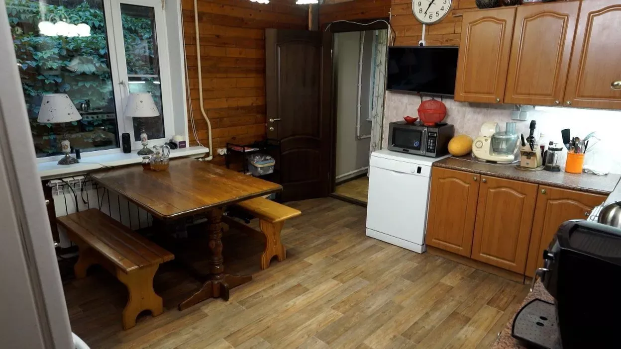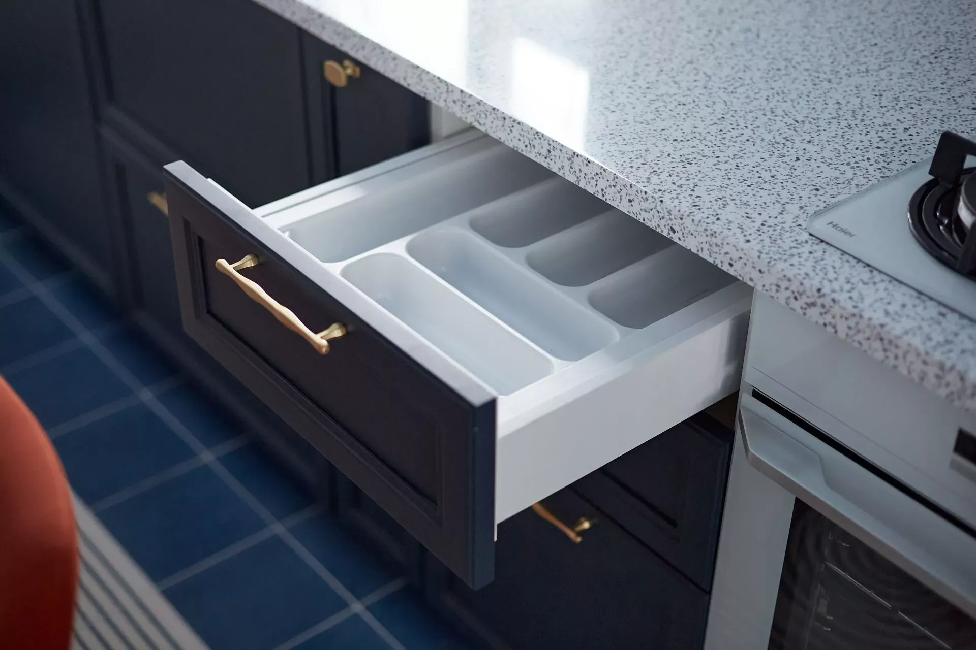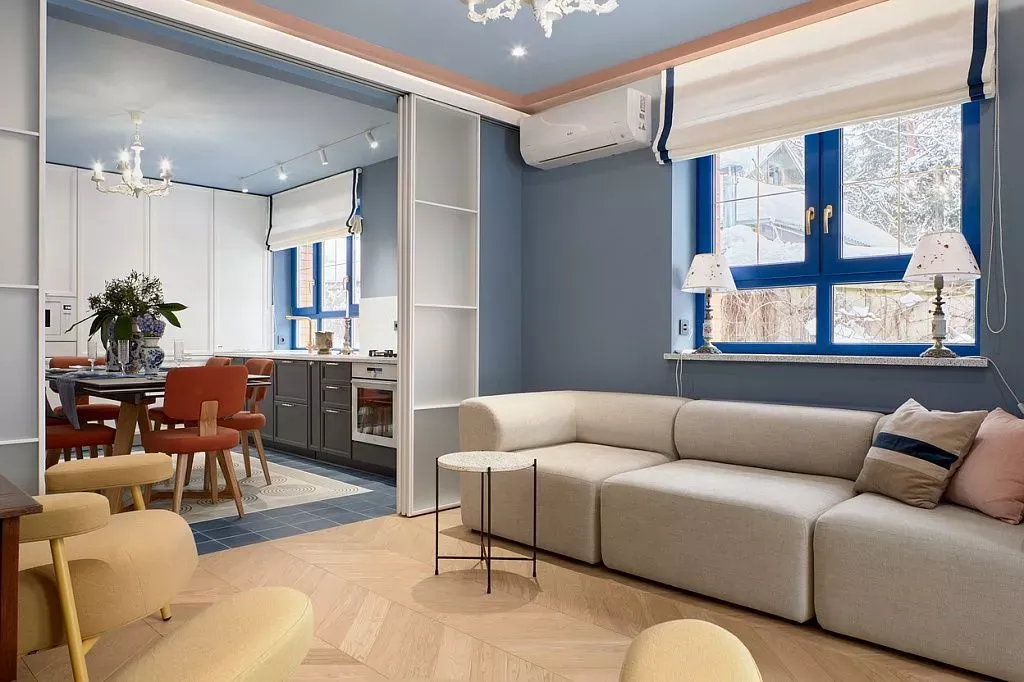 Цвет фасадов этой части кухни был тщательно подобран под цвет напольной плитки и стен, что позволило нам создать единое пространство. Фасады кухни выполнены из МДФ и окрашены со всех сторон матовой эмалью сложного глубокого синего цвета по RAL 5008.