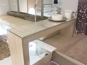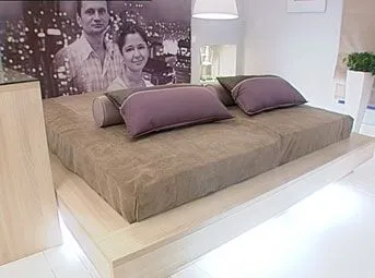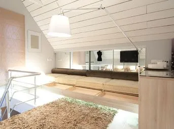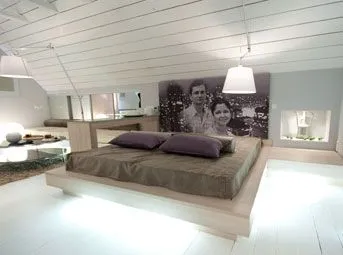 Мебель для мансарды подобрать нелегко: скошенный потолок и нетипичная высота стен ограничивали возможности расстановки. Однако, специалистам Mr.Doors удалось справиться с проблемой. В данном случае специалисты компании не использовали ни одну из 10 систем проектирования мебели, которые компания предлагает своим клиентам, а работали в так называемом стиле «свободного проектирования», создавая мебельную композицию, точно соответствующую замыслу дизайнера и учитывающую все особенности помещения. По периметру двух стен выстроен невысокий подиум из ламинированных плит цвета «Акация». На нем собрано большинство предметов мебели в комнате: диван, консольный стол, кровать, тумба. Подиум одновременно является и вместительной системой хранения – в него интегрированы пять выдвижных ящиков.