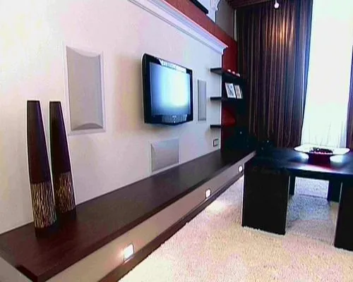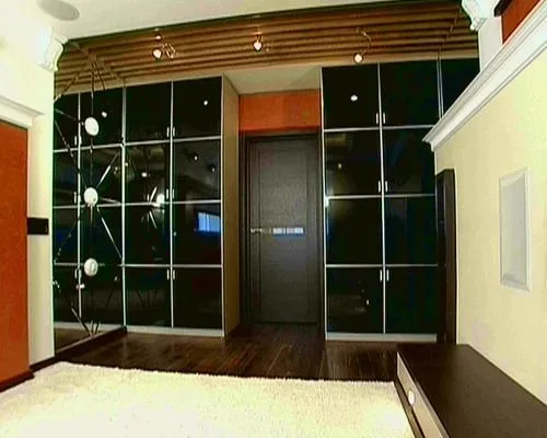 Всю фронтальную стену гостиной заняли шкафами Mr.Doors. Гардеробные шкафы с распашными фасадами и эффектной отделкой - алюминиевый профиль и чёрный лак - стали основным визуальным акцентом комнаты. Остальные элементы интерьера - мебельная группа: тумба под аппаратуру, небольшой вертикальный стеллаж для дисков, подиум вдоль стены и полки выдержаны в едином стиле - лаконичный дизайн и насыщенный коричневый оттенок, сочетающийся с цветом новой входной двери, облицованной натуральным шпоном венге.