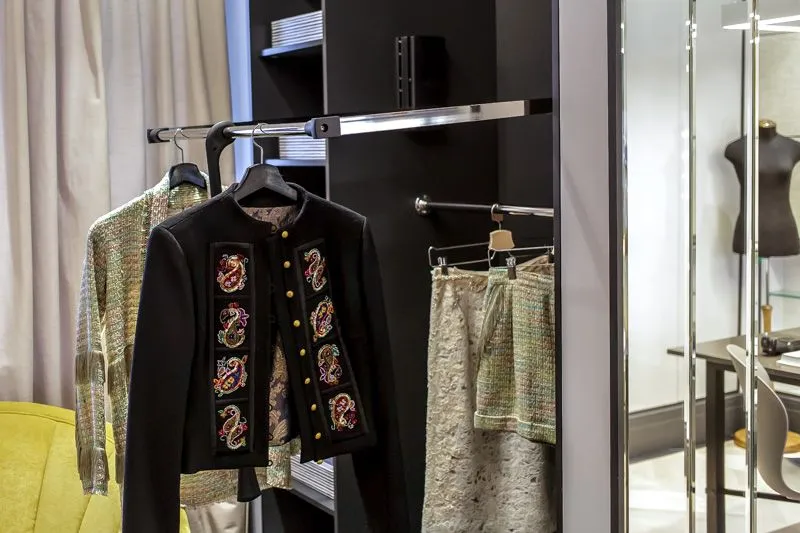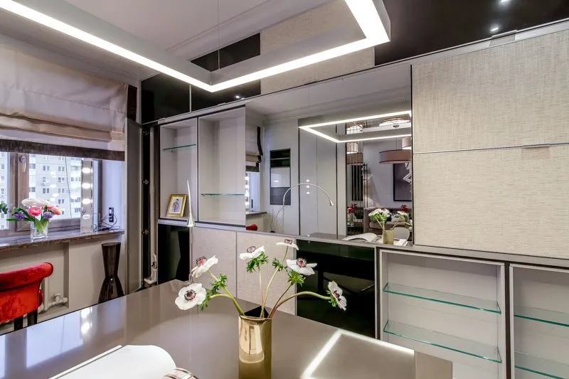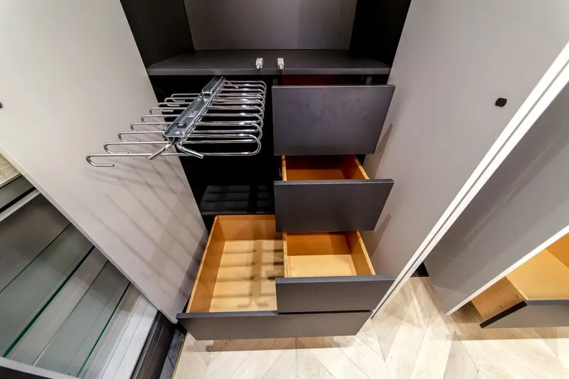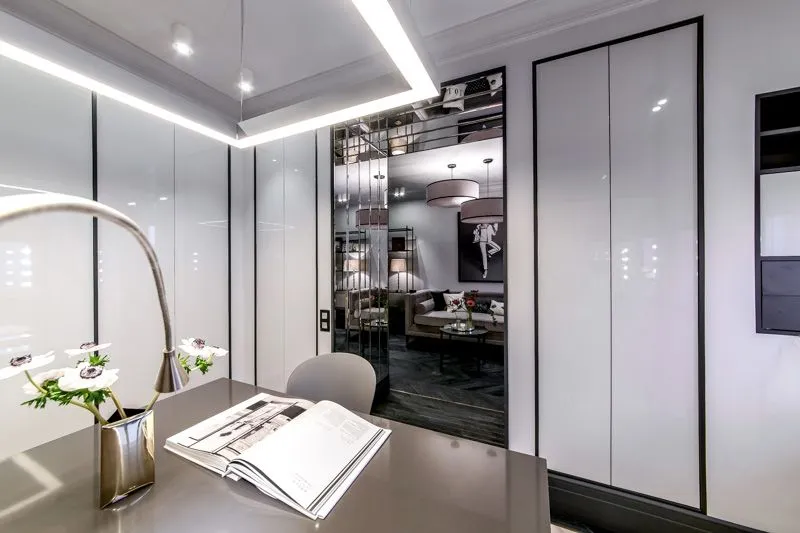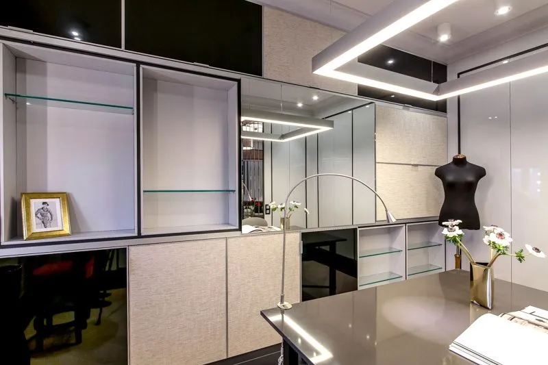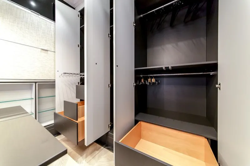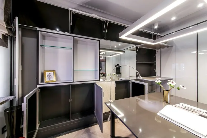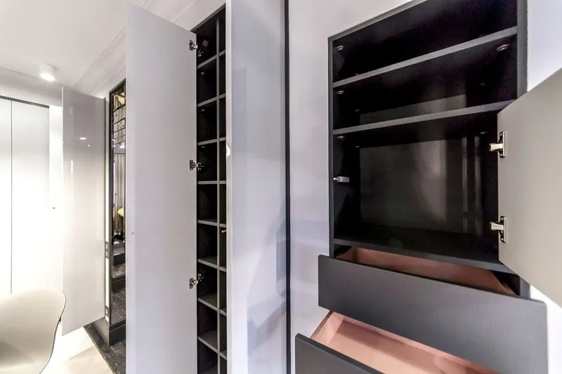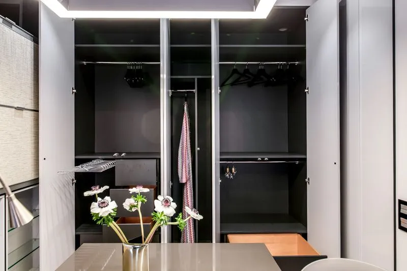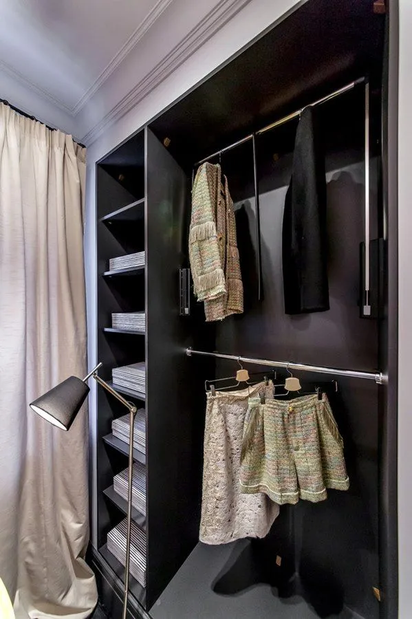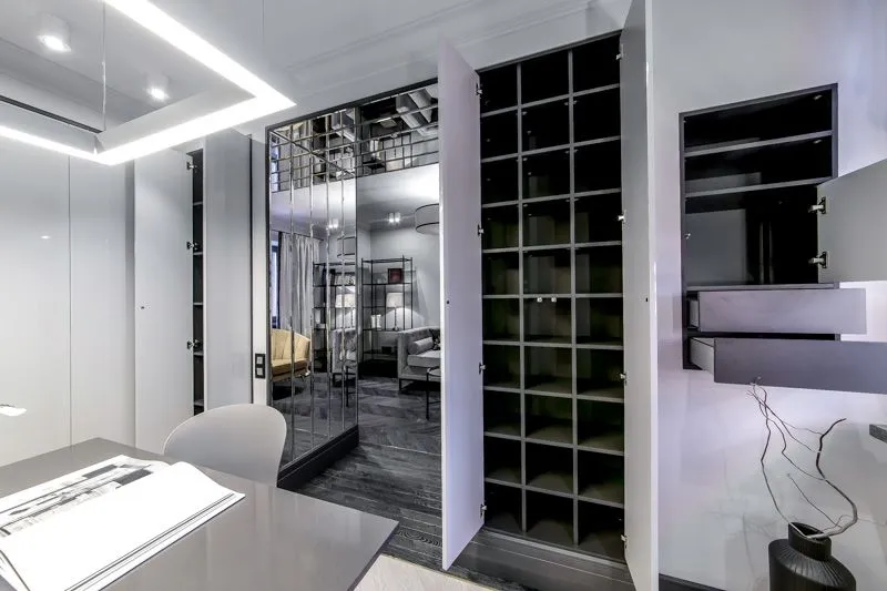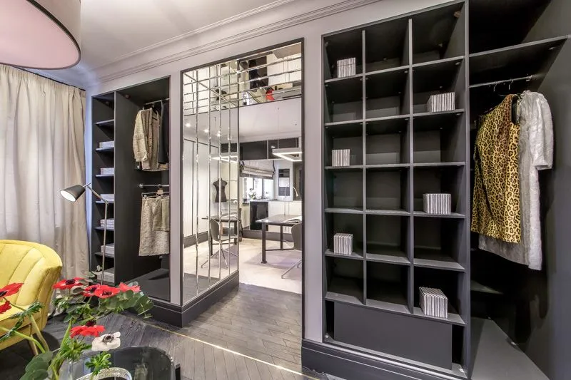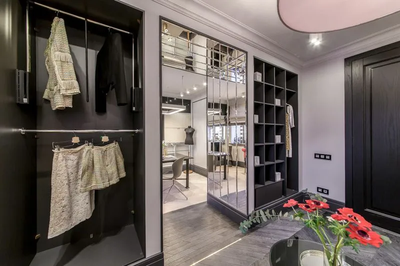 Одну из главных ролей в гостевой части играет многофункциональная модульная система, состоящая из открытых секций, как в модном шоу-руме. Она располагается с двух сторон от зеркальной арки. Для использования всего объема шкафа, от пола до потолка, секции для одежды оснащены вешалом-лифтом. В открытой части удобно хранить различные украшения, сумочки и модные аксессуары.