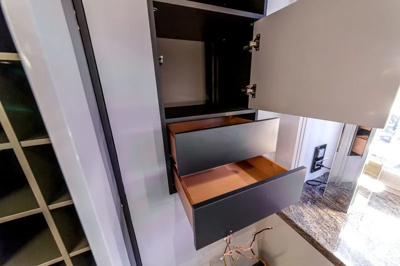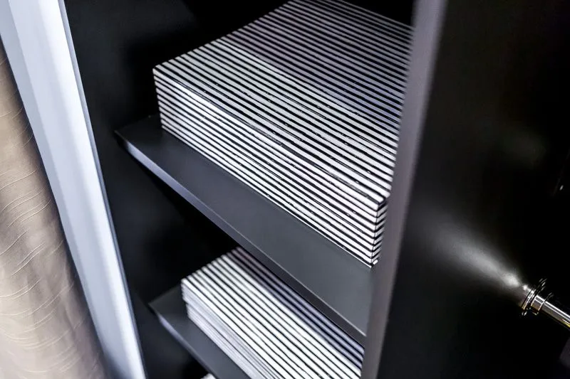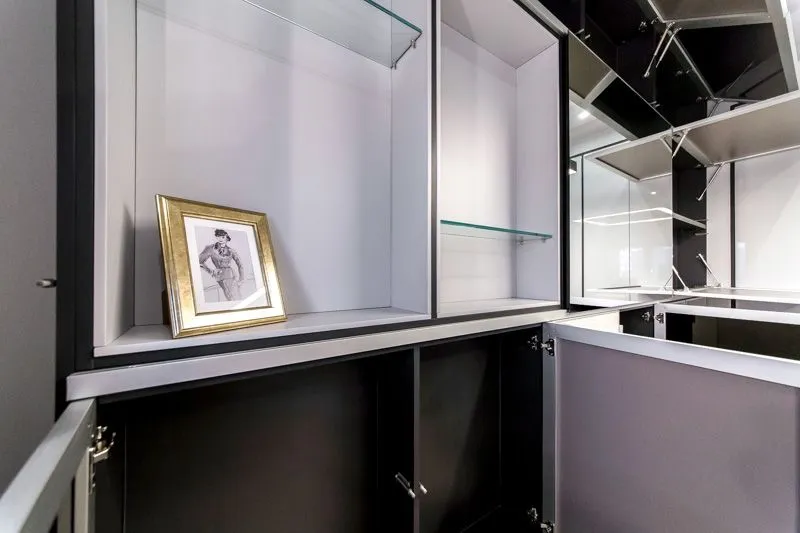 Часть фасадов откидывается вниз, часть – открывается вверх. Секции чередуются со сдвижной зеркальной панелью и традиционными распашными дверцами. Все распашные фасады открываются при помощи системы Push to Open (буквально – «нажал/открыл»). При желании экран телевизора можно закрыть зеркалом и открыть стеклянные полки, это была одна из реализованных задумок дизайнеров.