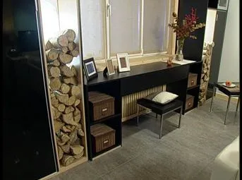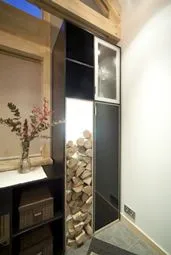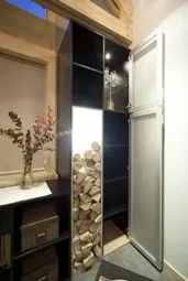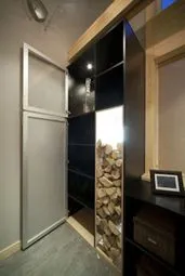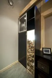 Второе отделение предназначено для хранения дров. Дополнительный короб в декоре «Дуб Феррара» вставлен в нишу, образованную корпусом черного цвета. В нишу также интегрирована оригинальная задняя стенка «Лайт»: скрытый за декоративным пластиком «Лёд белый» световой элемент дает рассеянную подсветку. Сам пластик вставлен в алюминиевую раму «Джамп 20» с отделкой видимой части пленкой ПВХ декора «Дуб Феррара».