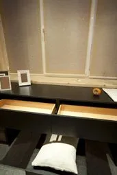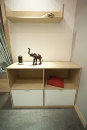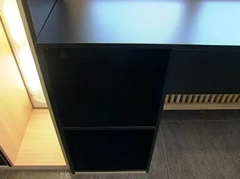 Стол между стеллажами выполнен из ламинированной плиты черного цвета. Под столешницей по центру расположены два выдвижных ящика с фасадами того же черного цвета. Фасады ящиков не имеют ручек, а оборудованы системой открывания «Push to Open»: «нажал-открыл». Открыть фасад можно несильным нажатием, а закрыть – притворив до фиксации.