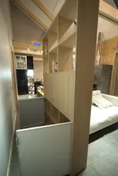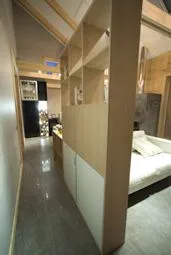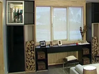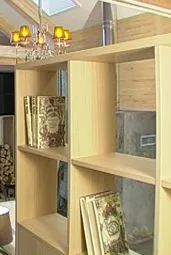 Высокий стеллаж также изготовлен из ламинированных панелей в декоре «Дуб Феррара» и является двусторонним. С одной стороны («смотрящей» в комнату) в нижней части – два распашных фасада в алюминиевых рамах «Футур», вставками в которые служат стекла белого цвета «Фарфор». Ручки на фасадах те же, что и у конструкций возле окна – «Футур». С обратной стороны нижней части стеллажа использованы ламинированные панели основного цвета, вложенные между перегородками от внутренних полок, в результате чего образовался оригинальный декоративный рисунок.