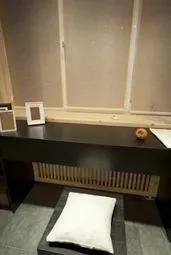 Первое закрыто распашным фасадом из алюминиевого профиля «Футур» цвета «Матовое серебро» со вставкой из прозрачного стекла. Видимая часть рамки, тонкая и элегантная, выглядит минималистично. Фасад снабжен алюминиевой профиль-ручкой «Футур» в цвет рамы. Внешние углы рамы закрываются специальными пластиковыми вставками, что делает фасад менее травмоопасным. В качестве задней стенки закрытого отделения использовано зеркало «Серебряное», полка выполнена из прозрачного стекла. В верхнюю панель встроен точечный светильник «Министар».