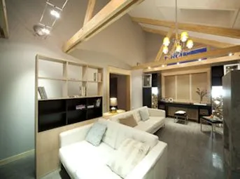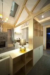 В центре комнаты устроена зона отдыха из двух диванов. Рядом с ними расположили два стеллажа – высокий и низкий.