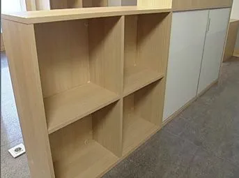 Верхняя часть каждого из стеллажей состоит из двух вертикальных отделений с полками посередине.