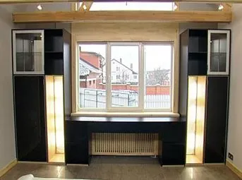 Вокруг окна выстроили почти симметричную композицию, состоящую из двух стеллажей и стола между ними. Корпус композиции выполнен из ламинированной плиты черного цвета, цокольная плита – как и во всех других мебельных конструкциях в этой комнате – из ламинированной плиты «Дуб Феррара» толщиной 25 мм светлого оттенка, имитирующей структуру дерева.