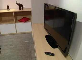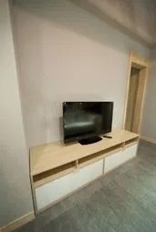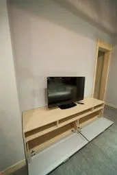Тумбы под телевизор и для хранения различных вещей выполнены в декоре «Дуб Феррара», в нижней части обеих конструкций – два откидных фасада в раме «Футур» со вставками из белого стекла «Фарфор». Ручки на фасадах, как и в других мебельных композициях, – «Футур» цвета «Матовое серебро».