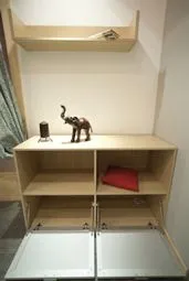 Верхняя часть стеллажа сквозная, доступна с обеих сторон и предназначена для хранения различных безделушек и милых сердцу хозяев мелочей.