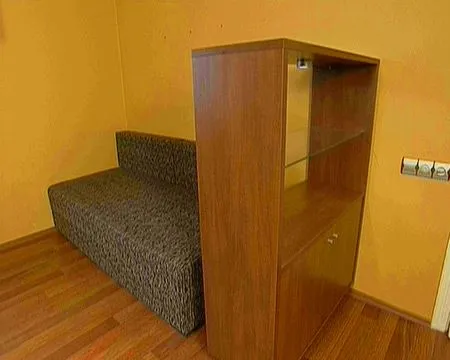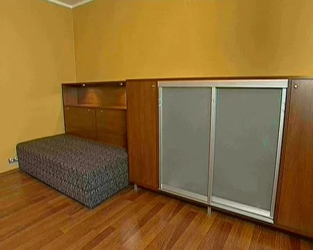 Мебельные конструкции выполнены в декоре "Орех Антик". Шкаф для одежды закрыт дверьми системы Noteborn (Нотеборн), со вставками из декоративного матового стекла. Все конструкции - отдельностоящие, их можно переставлять без демонтажа. (По материалам сайта программы "Квартирный вопрос", телеканал НТВ) |