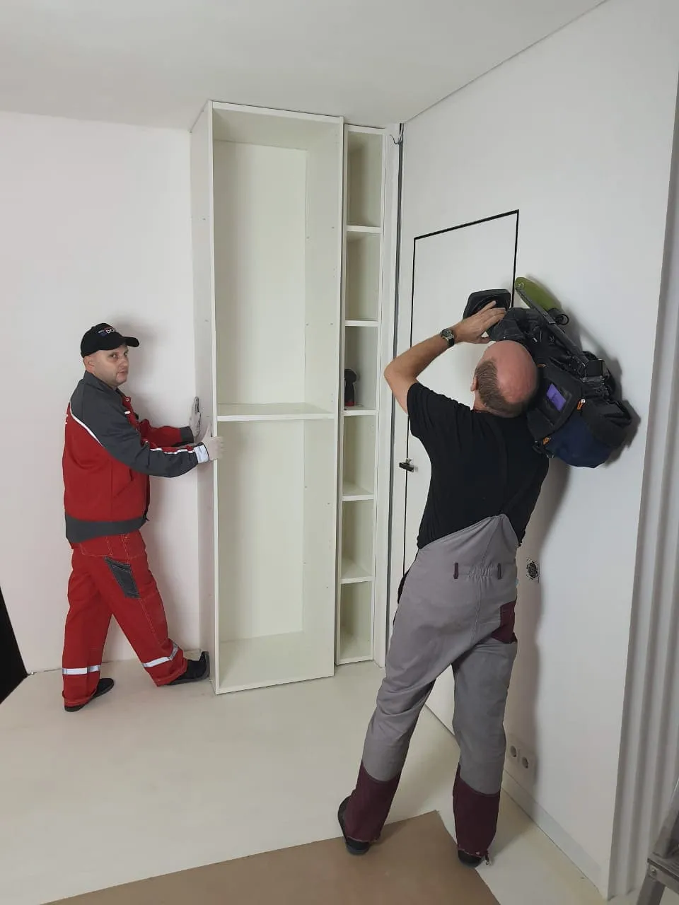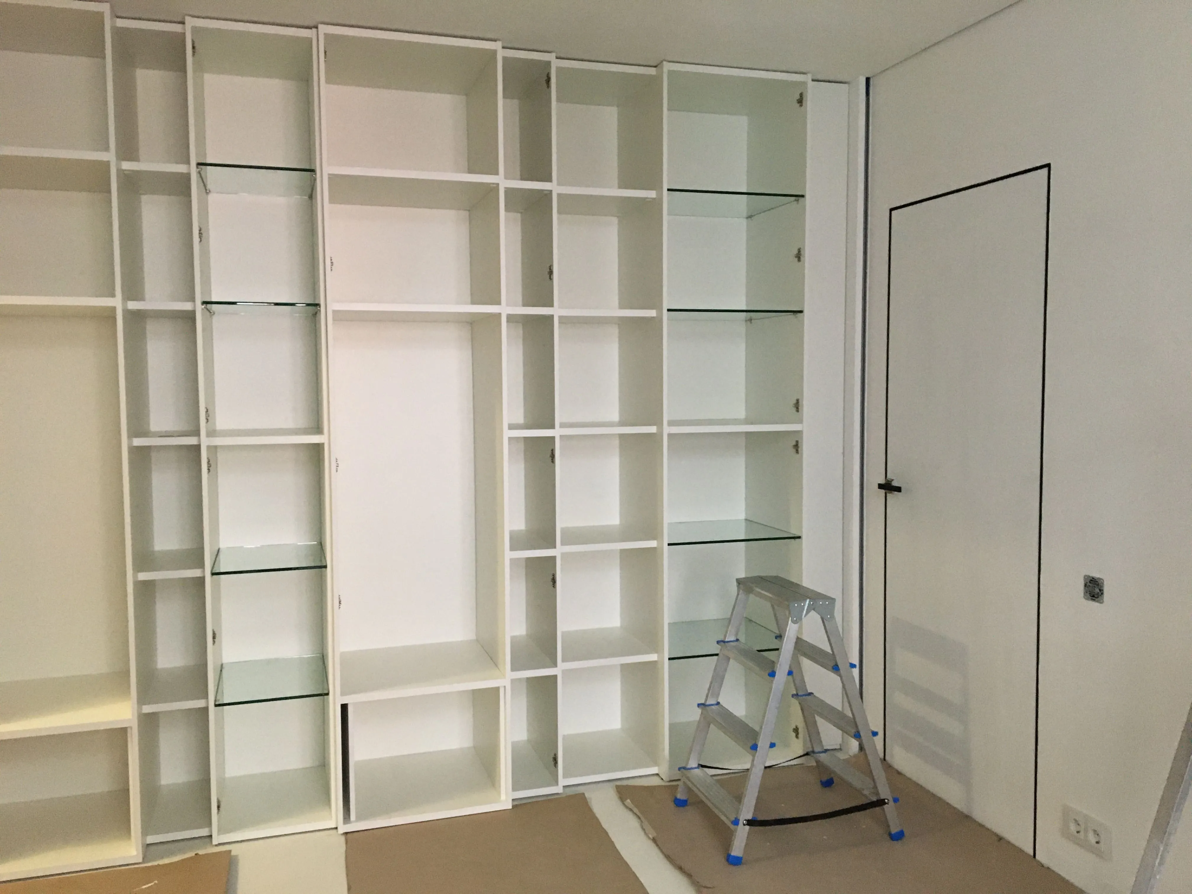 В белом объёме встроили шкаф от стены до стены, и от пола до потолка (3330х2605 мм). Точнее, это даже не шкаф, а сложная конструкция, составленная из разноглубоких модулей. Всё выполнено в эмали Алебастр.