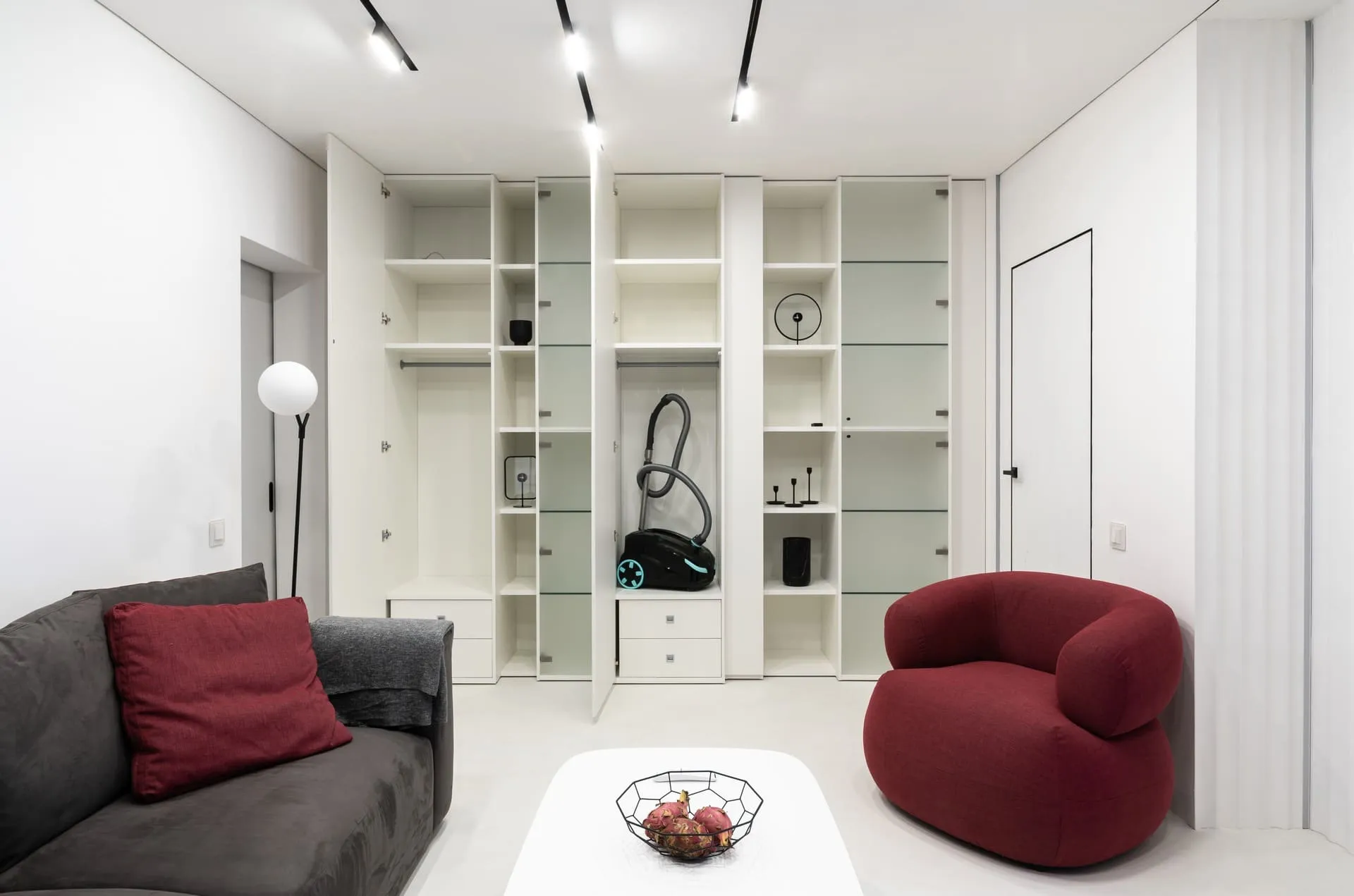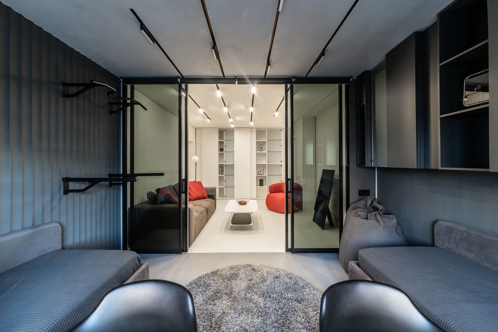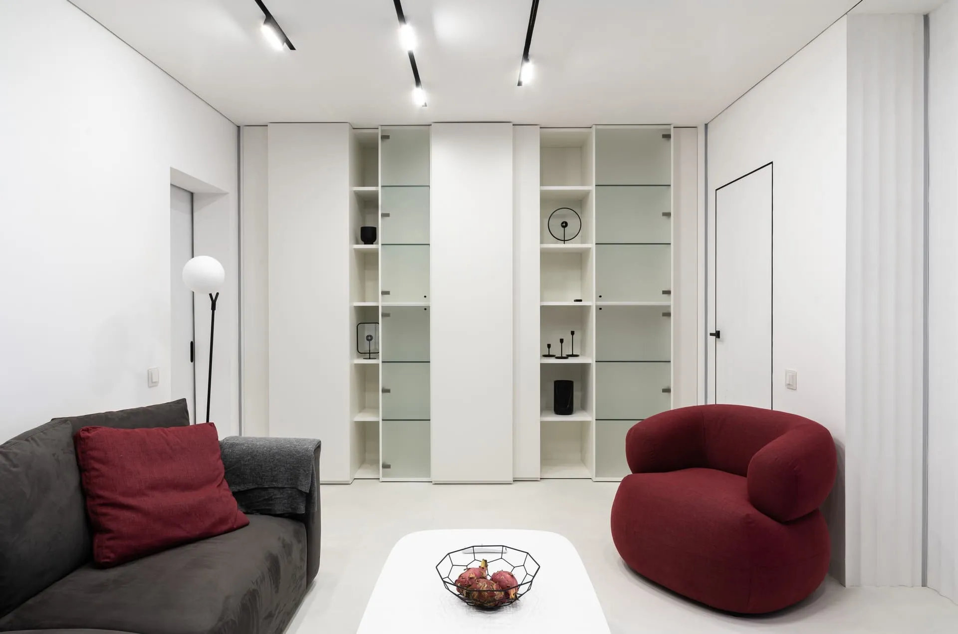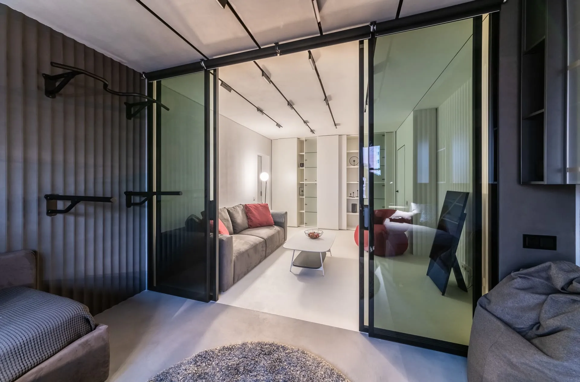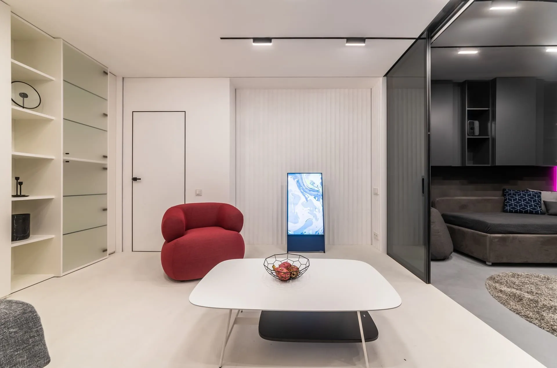 Команда «Квартирного вопроса» с помощью специалистов компании Mr.Doors реализовала сложный проект по созданию гостиной-подростковой. В одном большом помещении решили создать два объёма – белый и чёрный, с разными по задумке автора функциями.